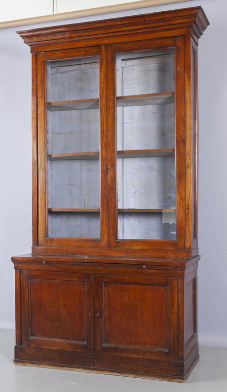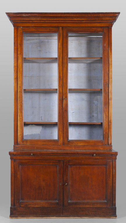 Libreria in noce a due sportelli, parte superiore a giorno, piano estraibile nella fascia, inizi sec.XIX