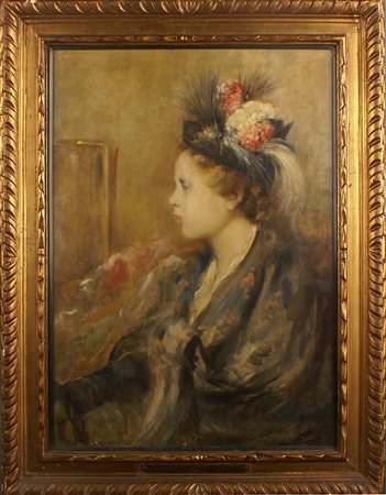 TEMISTOCLE LAMESI Roma 1870-1957 Il cappello della Mamma, olio su tela, firmato in basso a destra , entro cornice in legno dorato 70x50 cm.