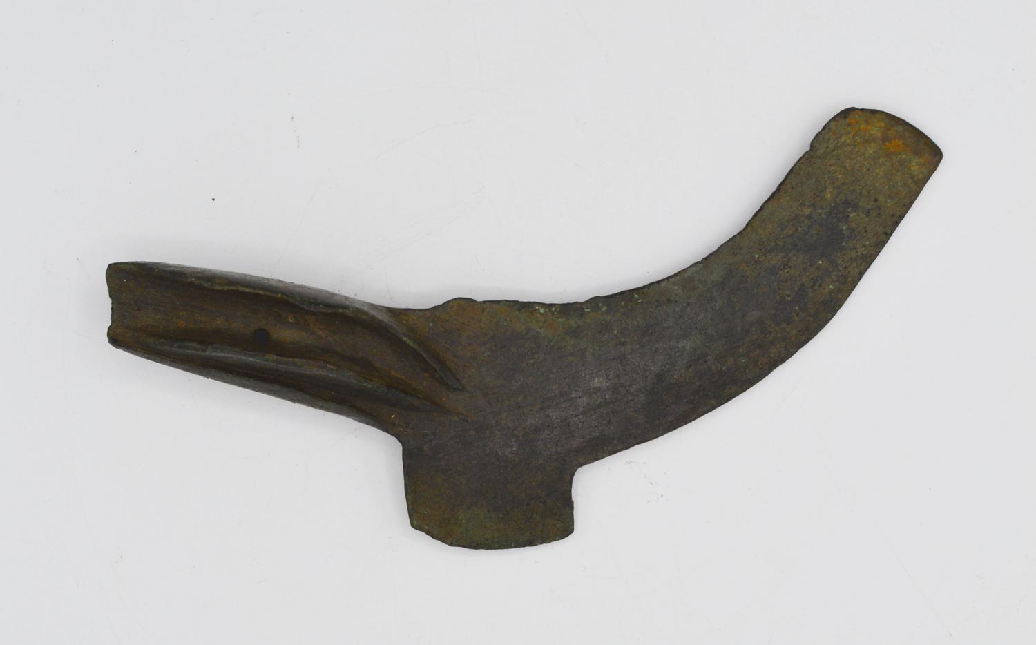 Falcetto in bronzo con lama ricurva, piccolo tallone rettangolare ed immanicatura con alette in rilievo.