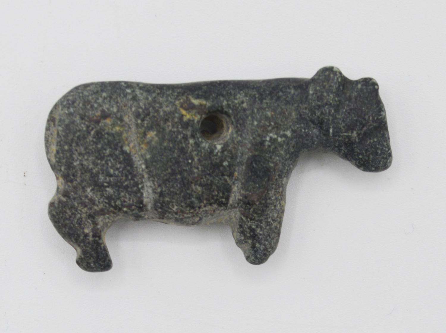 Piccolo pendente modellato come un bovino stante con la testa leggermente volta verso destra.