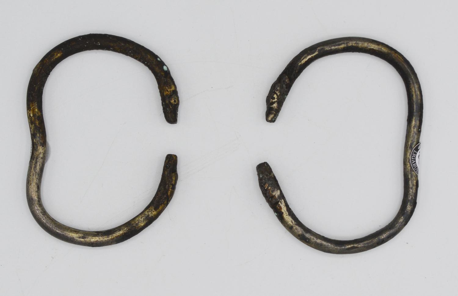 Due armille in verga d'argento di forma sinuosa, decorate alle estremita' da teste di serpente cesellate.