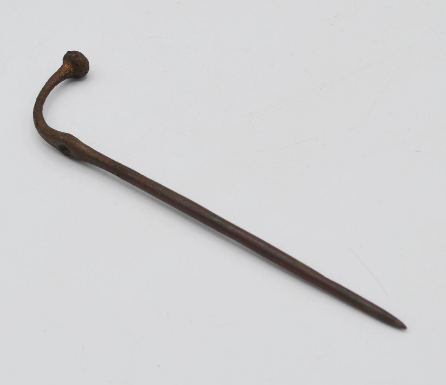 Lungo spillone con testa ricurva globulare e corpo cilindrico con foro passante per infilarvi il filo.