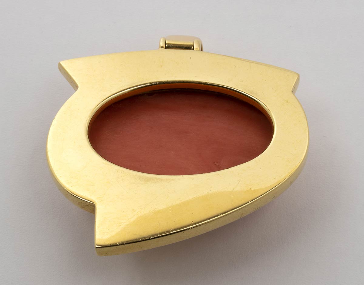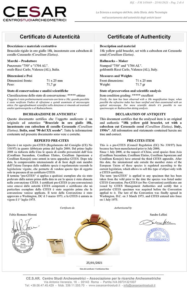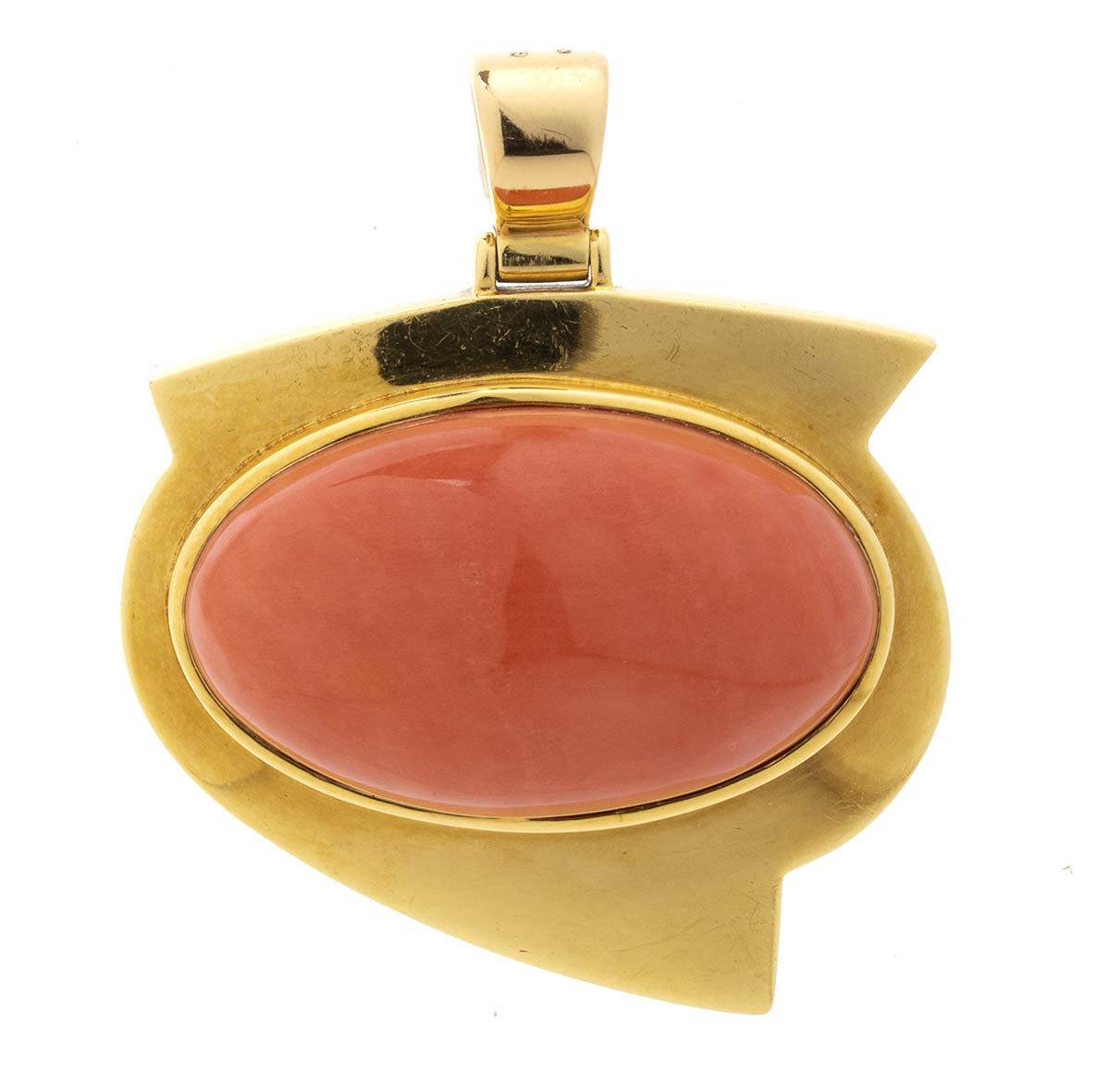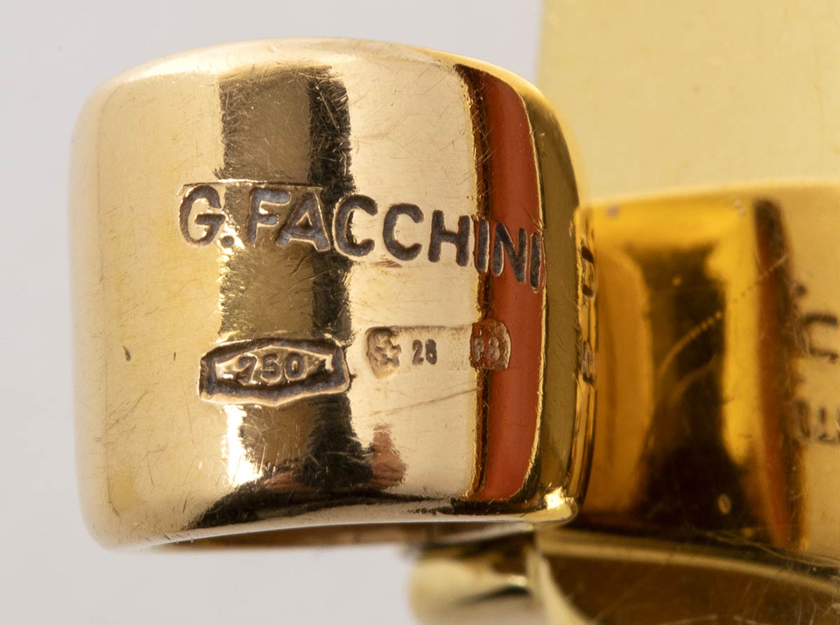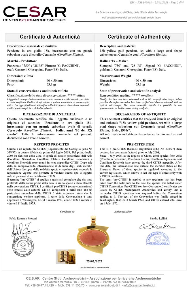 realizzato in oro 18k con grande cabochon ovale di corallo Cerasuolo (Corallium Elatius). Punzonato "750" e "28 PS". Firmato "G. FACCHINI". Dimensioni 60 x 50 mm. Peso 63,3 gr. Stato di conservazione: ***** ottimo. Accompagnato da certificato di autenticità Ce.S.Ar. Centro Studi Archeometrici.