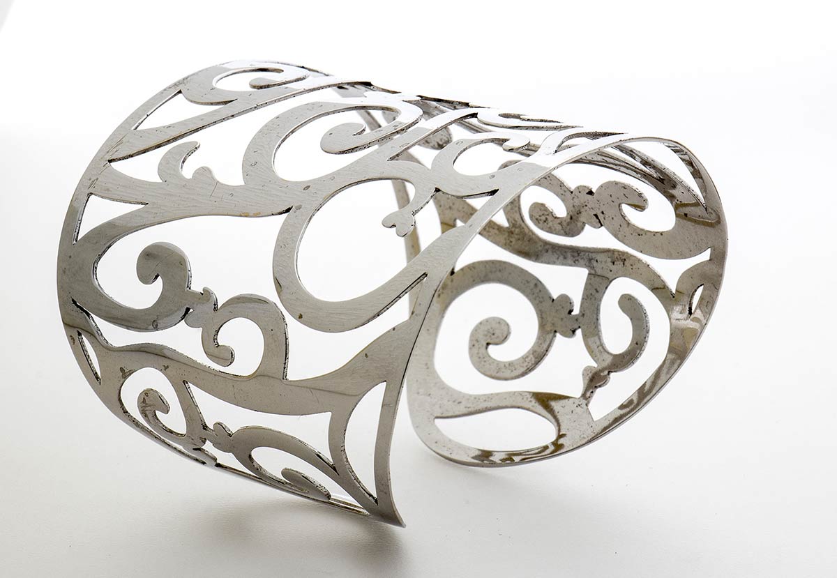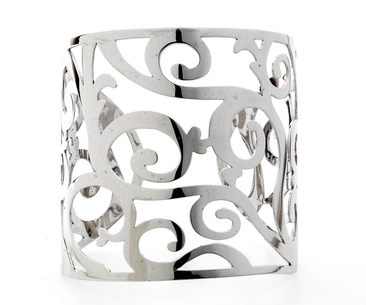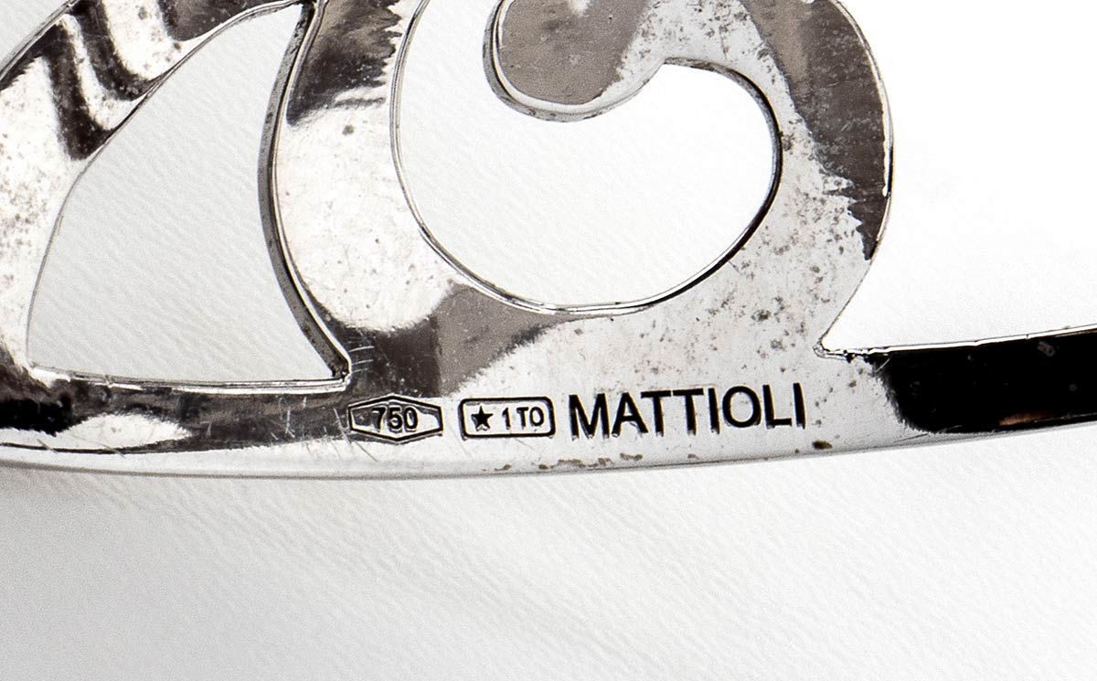 realizzato in oro bianco 18k, modello a fascia rigida traforato con motivi vegetali. Punzonato "750" e "1 TO". Firmato "Mattioli". Larghezza 60mm. Diametro 57mm. Peso 40gr. Stato di conservazione: ***** ottimo.