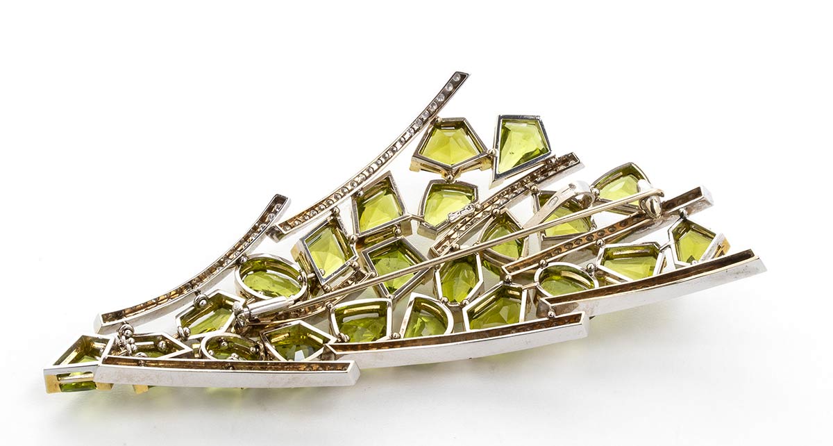 oro bianco 18k, con incastonati diamanti di forma rotonda e peridoti di varie forme. Punzonato "750" e "89 PD". Diamanti colore F-G purezza VVS-VS ct 3,50 ca. Dimensioni 115 x 55 mm. Peso 71,5 gr. Stato di conservazione: ***** ottimo.