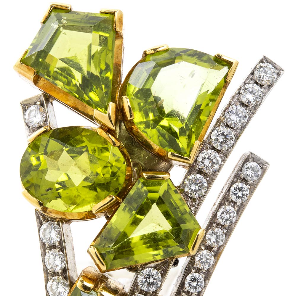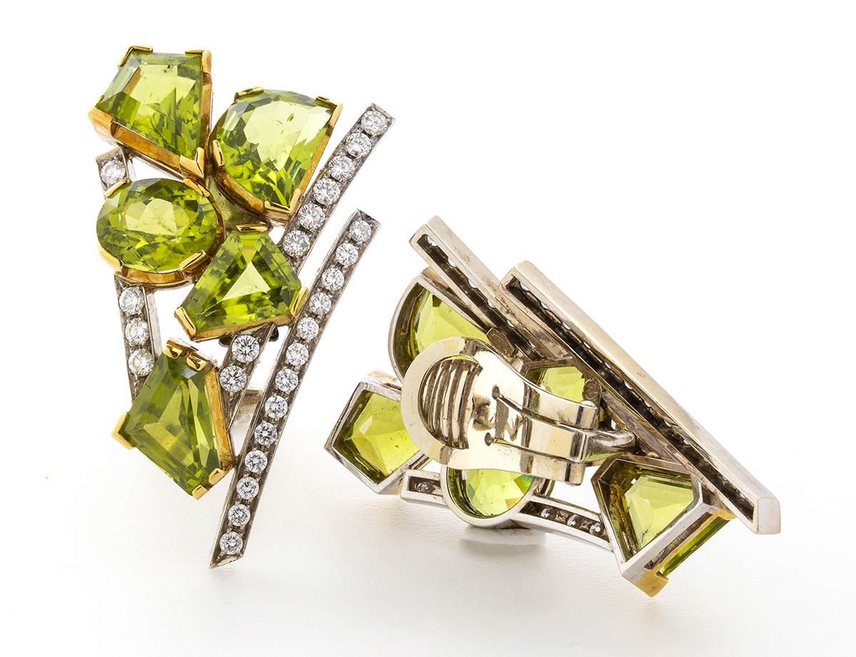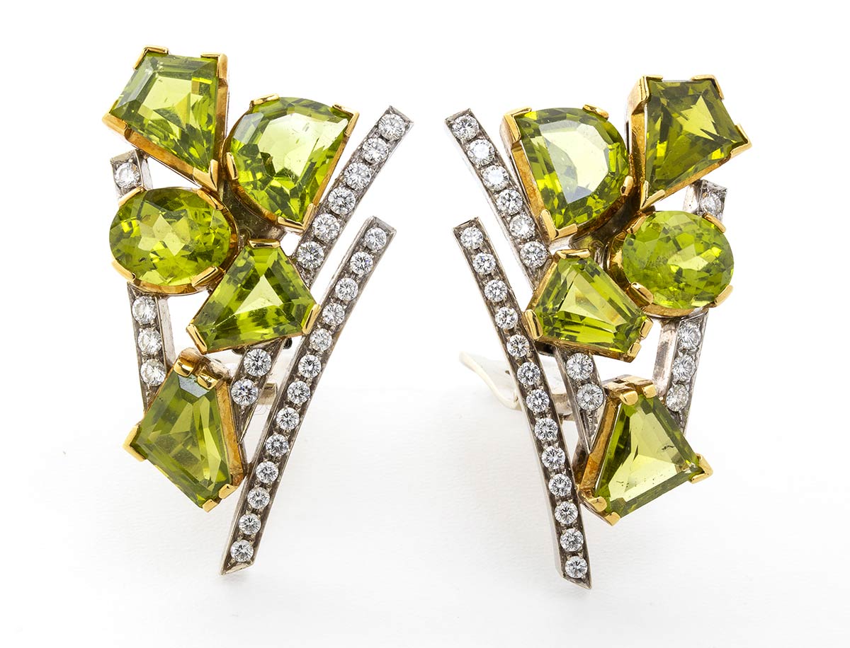 realizzati in oro bianco 18k, incastonati con peridoti di varie forme e diamanti di forma rotonda taglio brillante 2,00 ct ca., F-G purezza VVS-VS ct 2,00 ca. Punzonato "750" e "89 PD". Dimensioni 40 x 25 mm. Peso 31,7 gr. Stato di conservazione: ***** ottimo.
