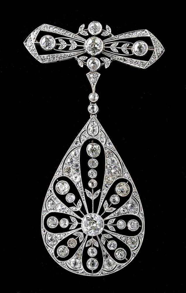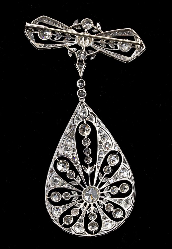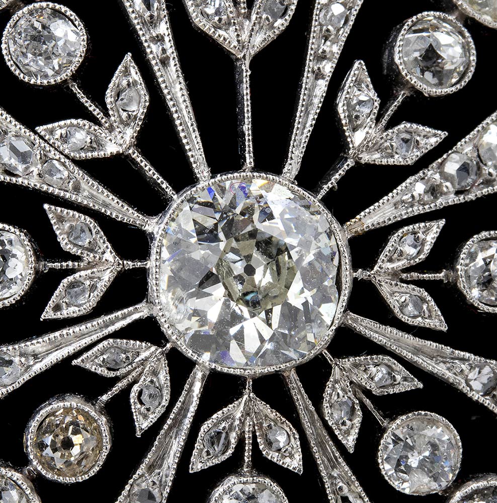 realizzato in oro bianco 18k, incastonata con diamanti di taglio "old mine" 14,00 ct ca. Dimensioni 90 x 50 mm. Peso 24 gr. Stato di conservazione: ***** ottimo.