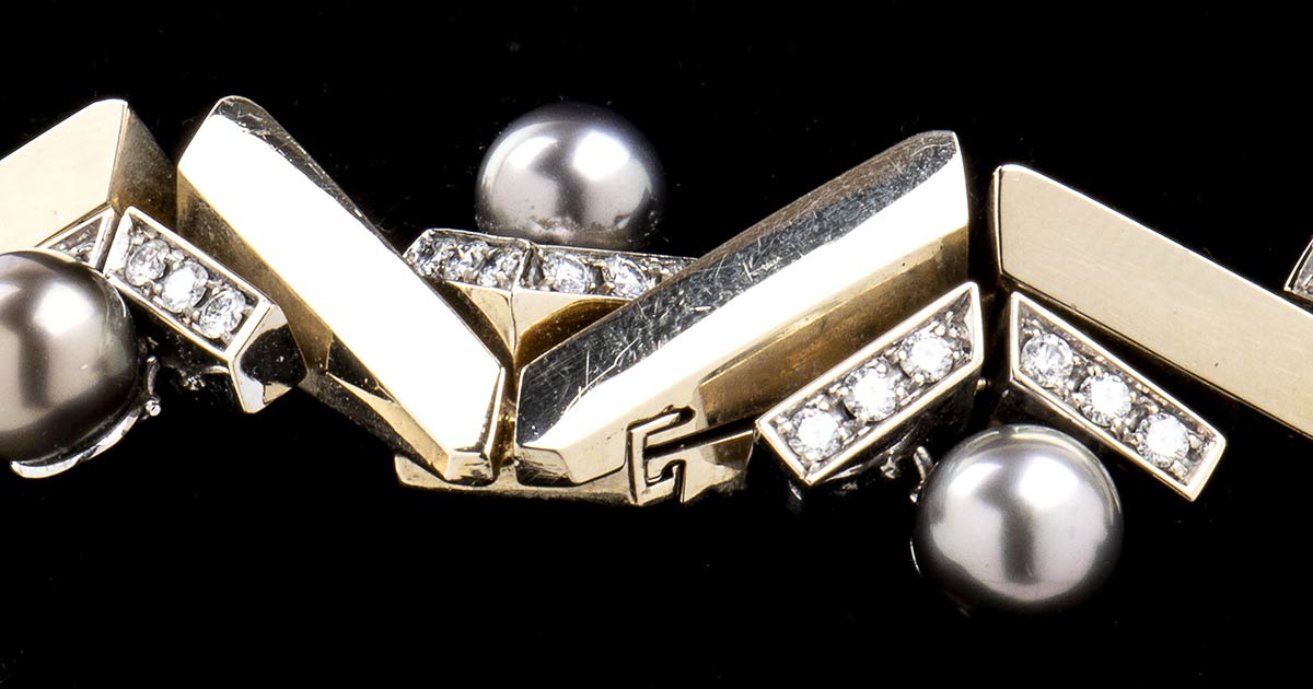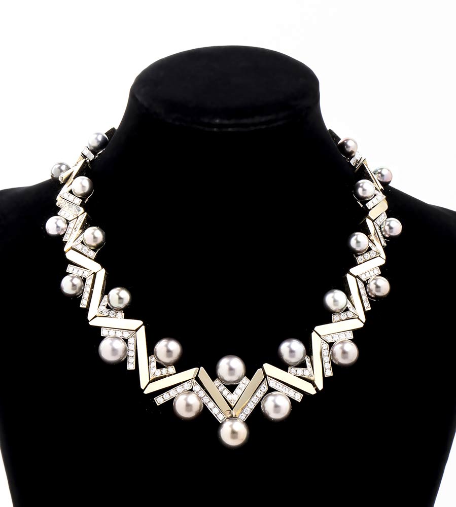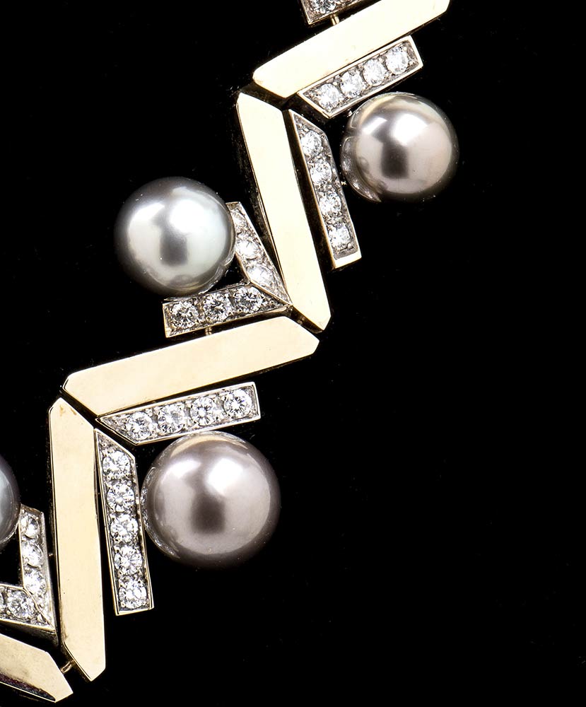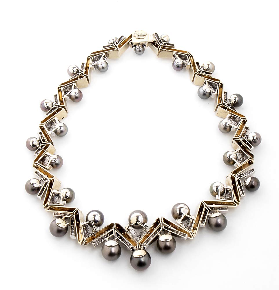 realizzata in oro bianco 18k, modello semirigido con perle Tahiti e diamanti di forma rotonda taglio brillante 5,00 ct ca., F-G, VVS-VS. Perle Tahiti diametro 12,5-11-7,5 mm. Punzonato "750" e "89 PD". Lunghezza: 42 cm. Peso 155 gr. Stato di conservazione: ***** ottimo.