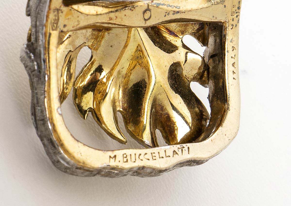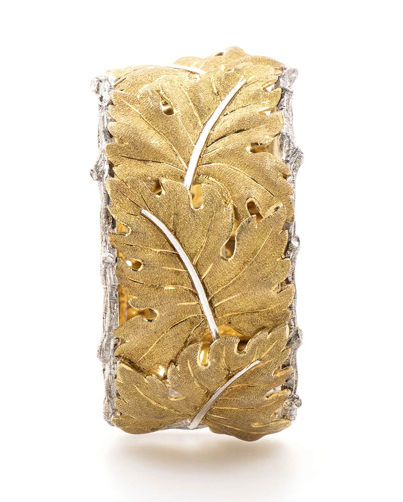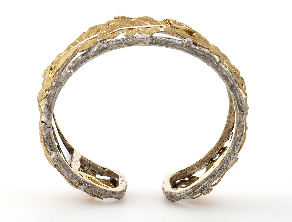 a cerchio rigido realizzato in due colori d'oro 18k con montatura traforata, modellata a foglie in oro satinato. Firmato "M. Buccellati". Dimensione fronte 68 x 30 mm. Dimensioni interne 60 x 50 mm. Peso 86,5 gr. Stato di conservazione: ***** ottimo.