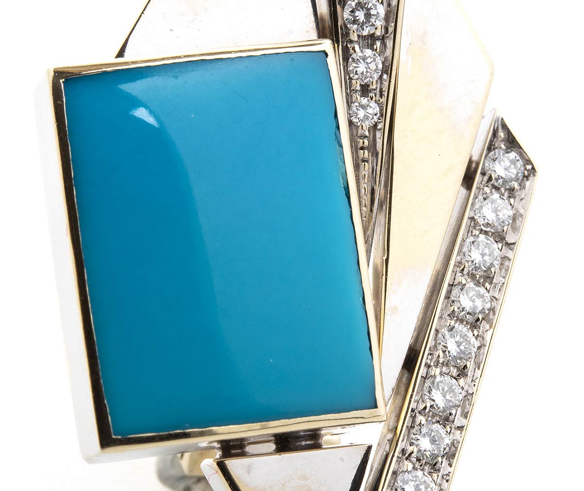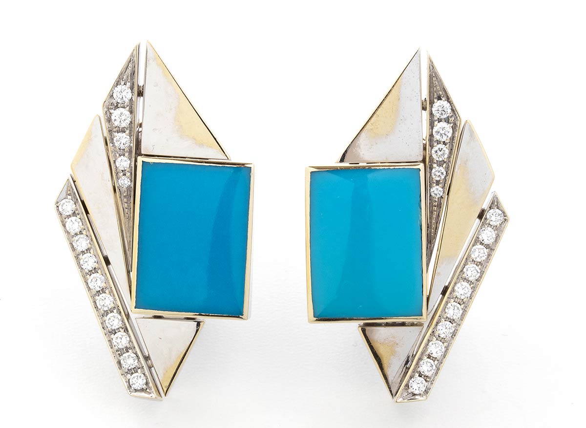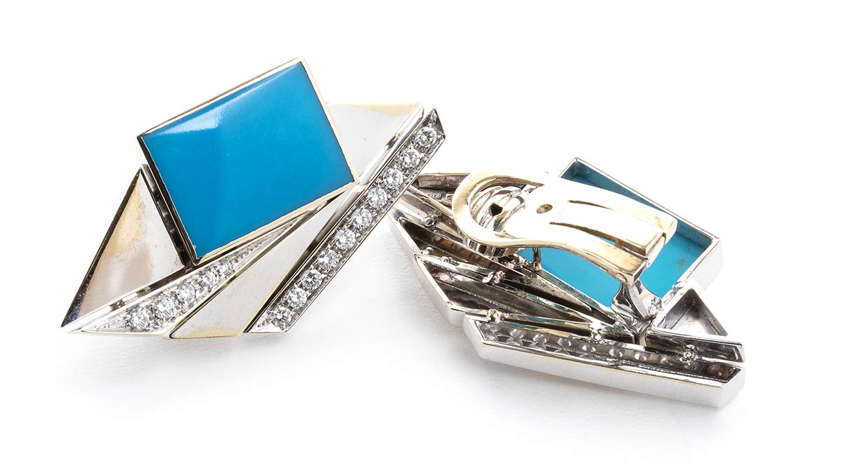 realizzati in oro bianco 18k, con inserti geometrici di di turchese, incastonati con diamanti di forma rotonda taglio brillante 0,80 ct ca., F-G, VVS. Dimensioni 40 x 25 mm. Peso 30,3 gr. Stato di conservazione: ***** ottimo.