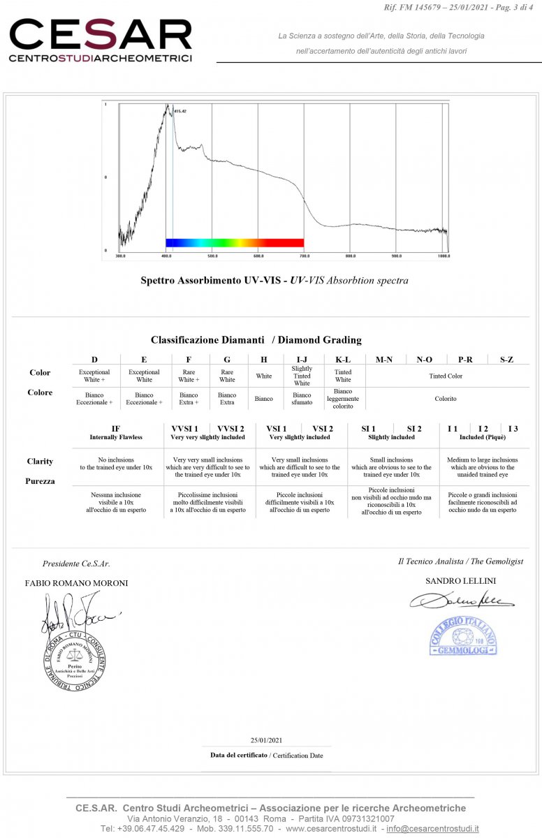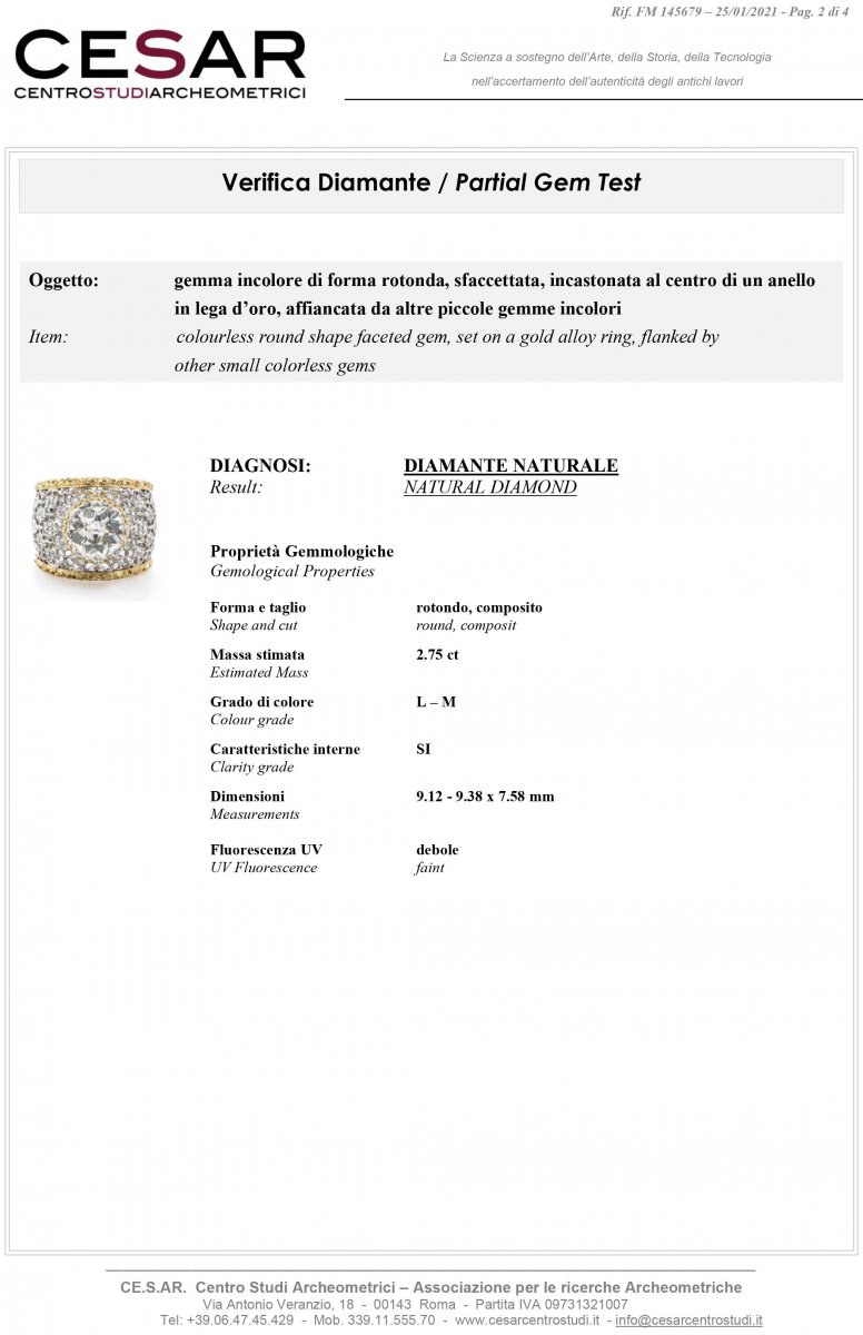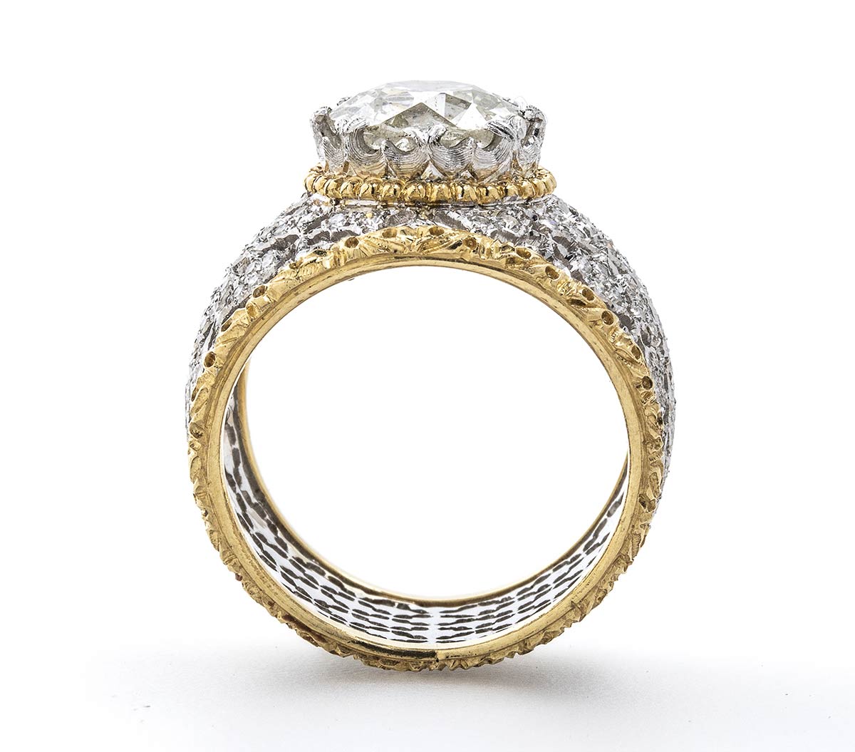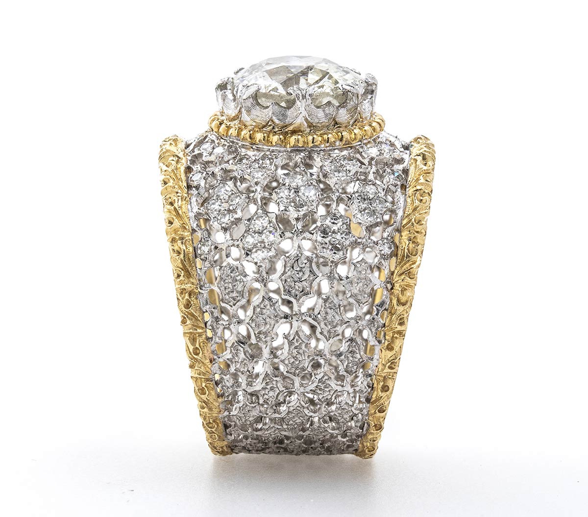 realizzato in due colori d'oro 18k, larga fascia lavorata traforata secondo lo stile di Buccellati, punteggiata da diamanti taglio huit-huit con centrale diamante di forma rotonda taglio vecchio europeo 2,75 ct ca., L-M, SI-P. Manifattura Buccellati, Milano. Firmato "Federico Buccellati". Punzonato "750" e "1168 MI". Dimensioni fronte 23 x 20 mm. Peso 12,5 gr. Misura IT 18,5 - US 8,5. Stato di conservazione: ***** ottimo. Il lotto e' accompagnato da certificato di verifica gemmologica Ce.S.Ar. Centro Studi Archeometrici.