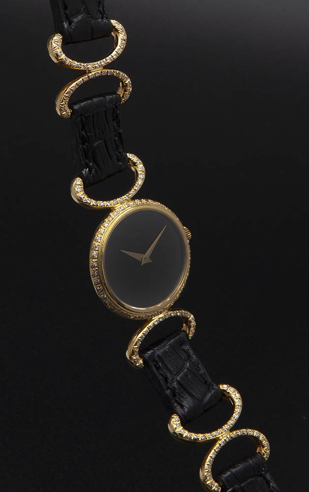 in oro giallo 18k con diamanti sulla cassa e sul bracciale, quadrante nero; movimento a carica manuale. Referenza 9802DB. Cinturino in pelle di alligatore lavorato a mano. Dimensioni cassa 27 x 24 mm. Lunghezza bracciale 16 cm. Stato di consevazione: ***** ottimo. Il cinturino dell’orologio qui rappresentato è stato realizzato con pellame appartenente ad una specie in via di estinzione protetta dalla normativa CITES, viene quindi mostrato solo a scopo espositivo e non è in vendita. Bertolami Fine Art rimuoverà e conserverà il cinturino prima della spedizione al nuovo acquirente. In alcuni luoghi di vendita, Bertolami Fine Art potrà, a sua discrezione, mettere a disposizione dell'acquirente del lotto il cinturino della specie minacciata gratuitamente se ritirato di persona nel luogo di vendita.