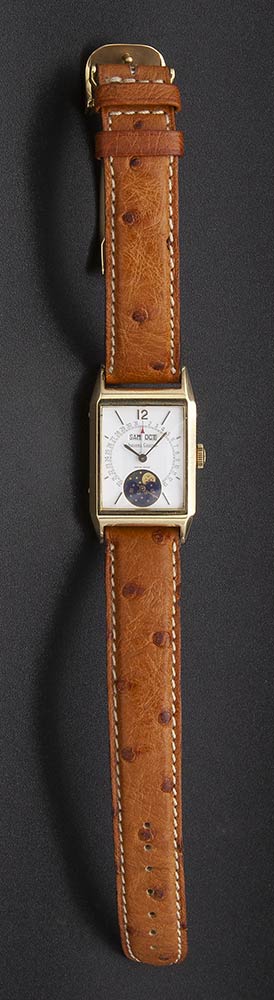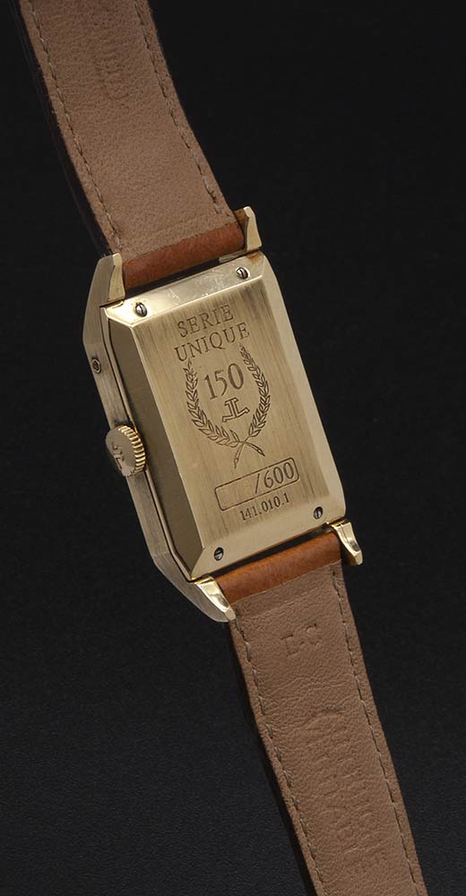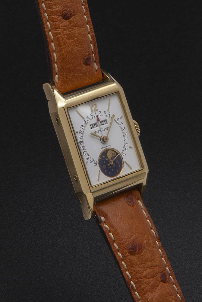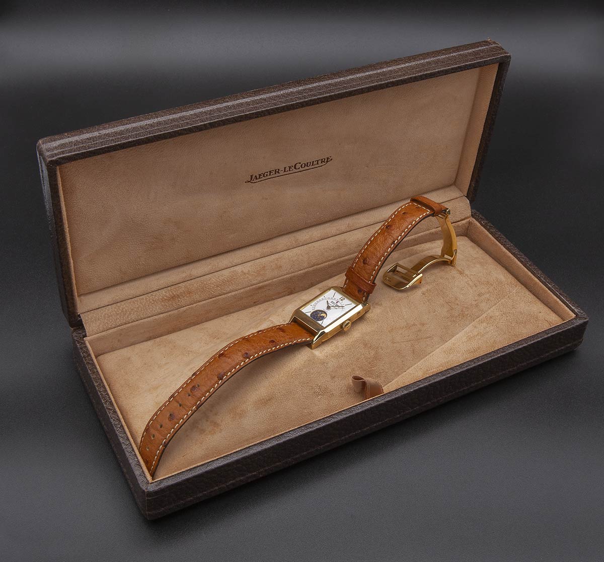 di forma rettangolare in oro 18k, quadrante bianco con fasi lunari, triplo calendario e indici a bastone; movimento cal. 486. Referenza 141.010.1, serie limitata nr 278/600, realizzato nel 1983 per il 150° anniversario della Jaeger LeCoultre. Cinturino con fibbia originale. Dimensioni cassa 24 x 41 mm, spessore 9 mm. Corredato di scatola originale. Stato di conservazione: ***** ottimo.