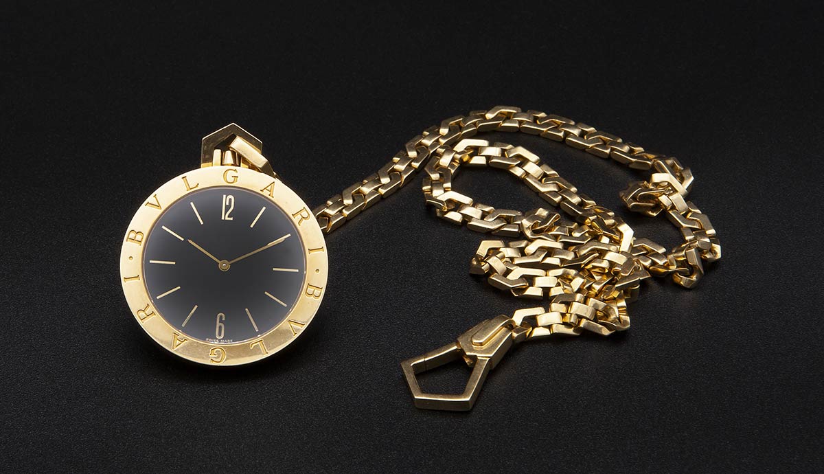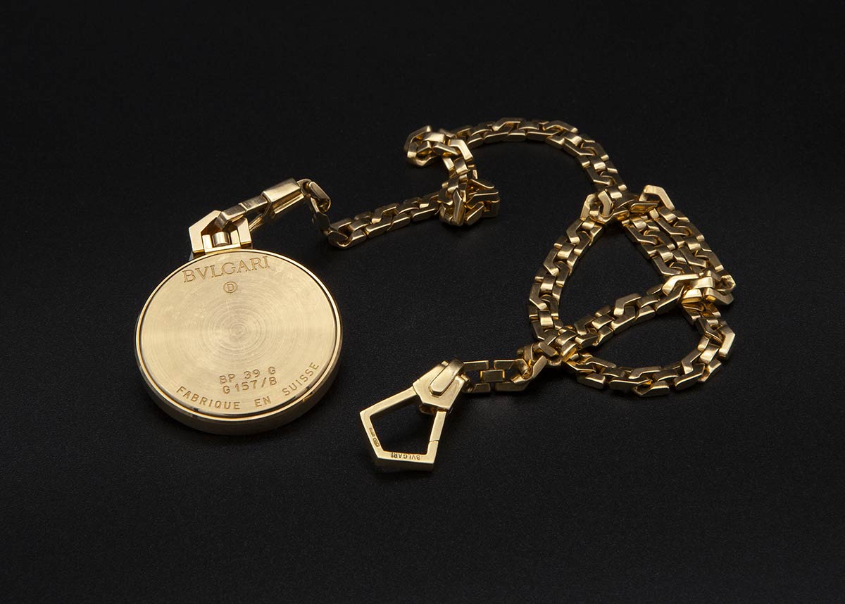 in oro giallo 18k con catena in oro giallo; movimento al quarzo. Referenza BP 39 G, anni '90. Firmato "Bvlgari". Diametro 44 mm. Peso complessivo 115,4 gr. Stato di conservazione: ***** ottimo.
