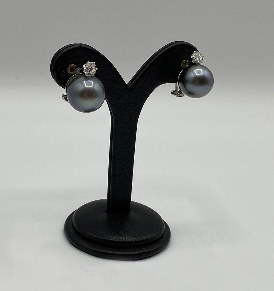 in oro bianco 18k, con perle Tahity e diamanti taglio brillante 1,05 ct ca., E-F, VVS. Diametro perle 13,5- 14 mm. Punzonati "750". Dimensioni fronte 18,5 x 14 mm. Peso 13,6 gr. Stato di conservazione: ***** ottimo.