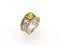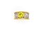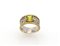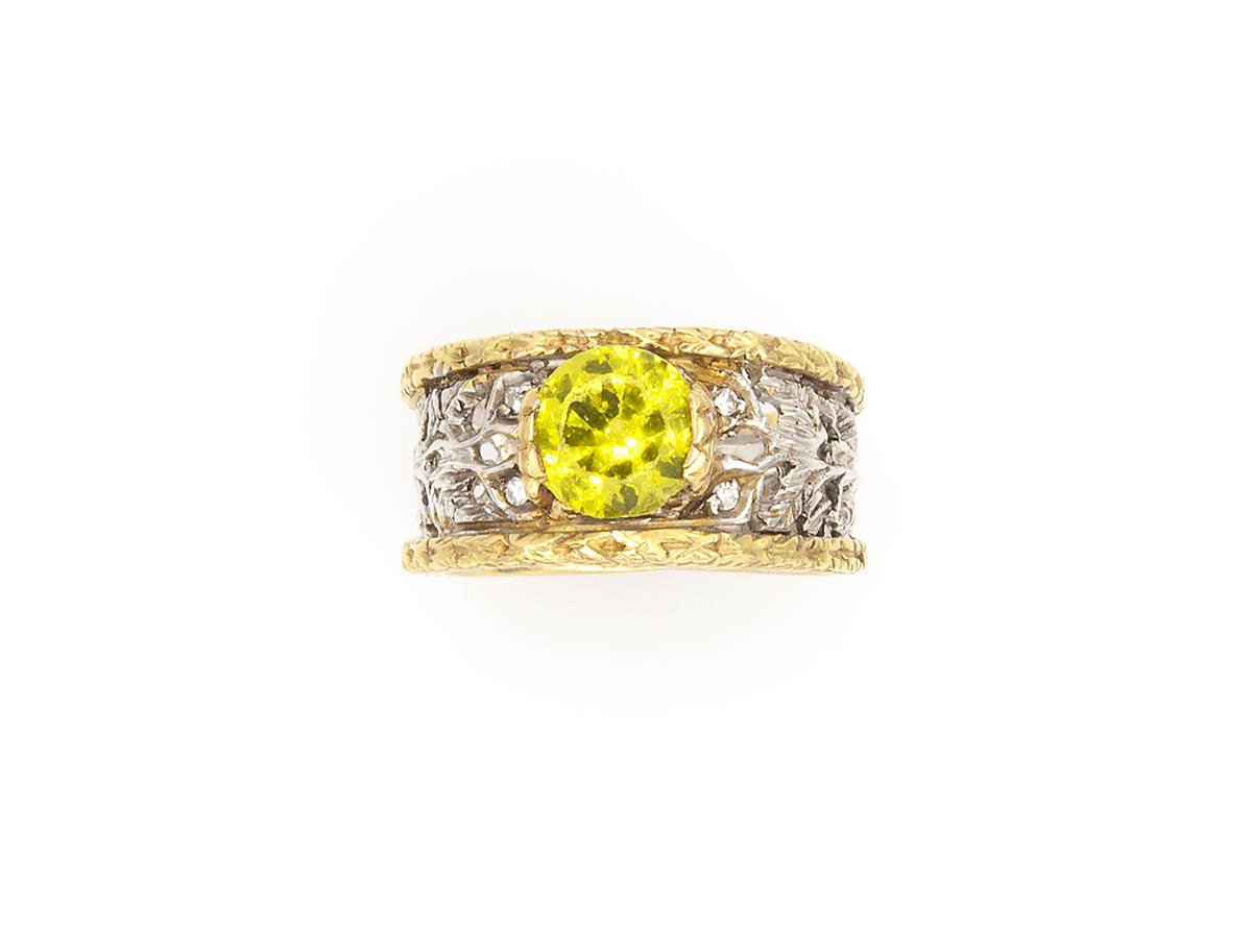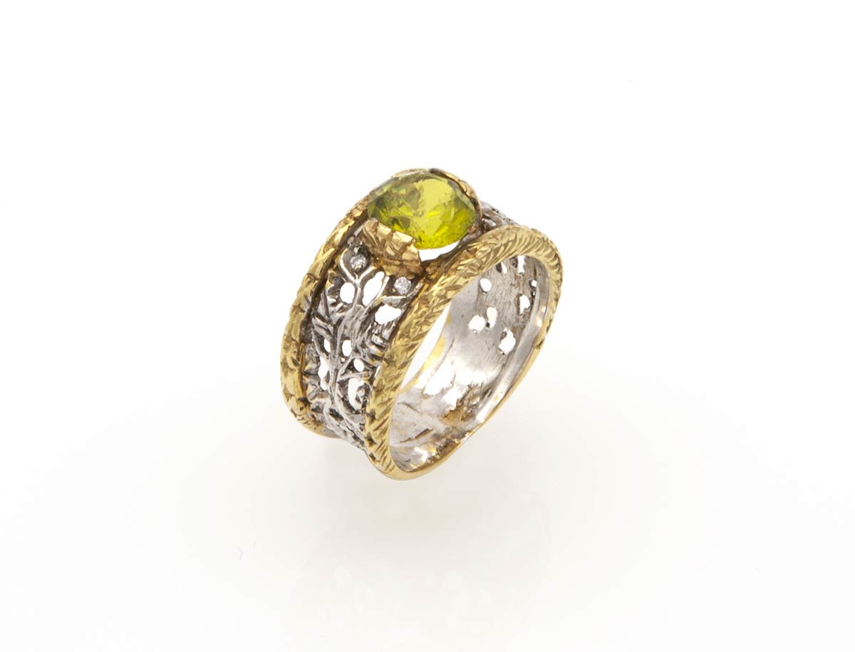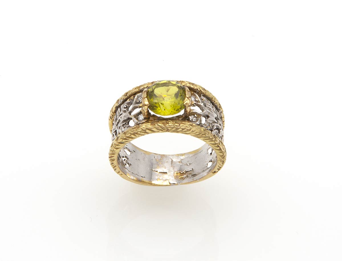 in due colori d'oro 18k, modelato come una fascia traforata a motivi vegetali, incastonato con peridoto affiancato da diamanti di forma rotonda taglio brillante 0,06 ct ca., G, VVS. Peso 6,1 gr. Misura IT 13 - US 6,5. Stato di conservazione: ***** ottimo.