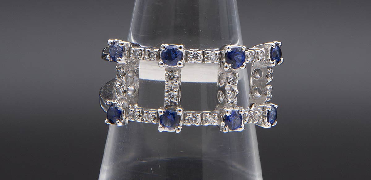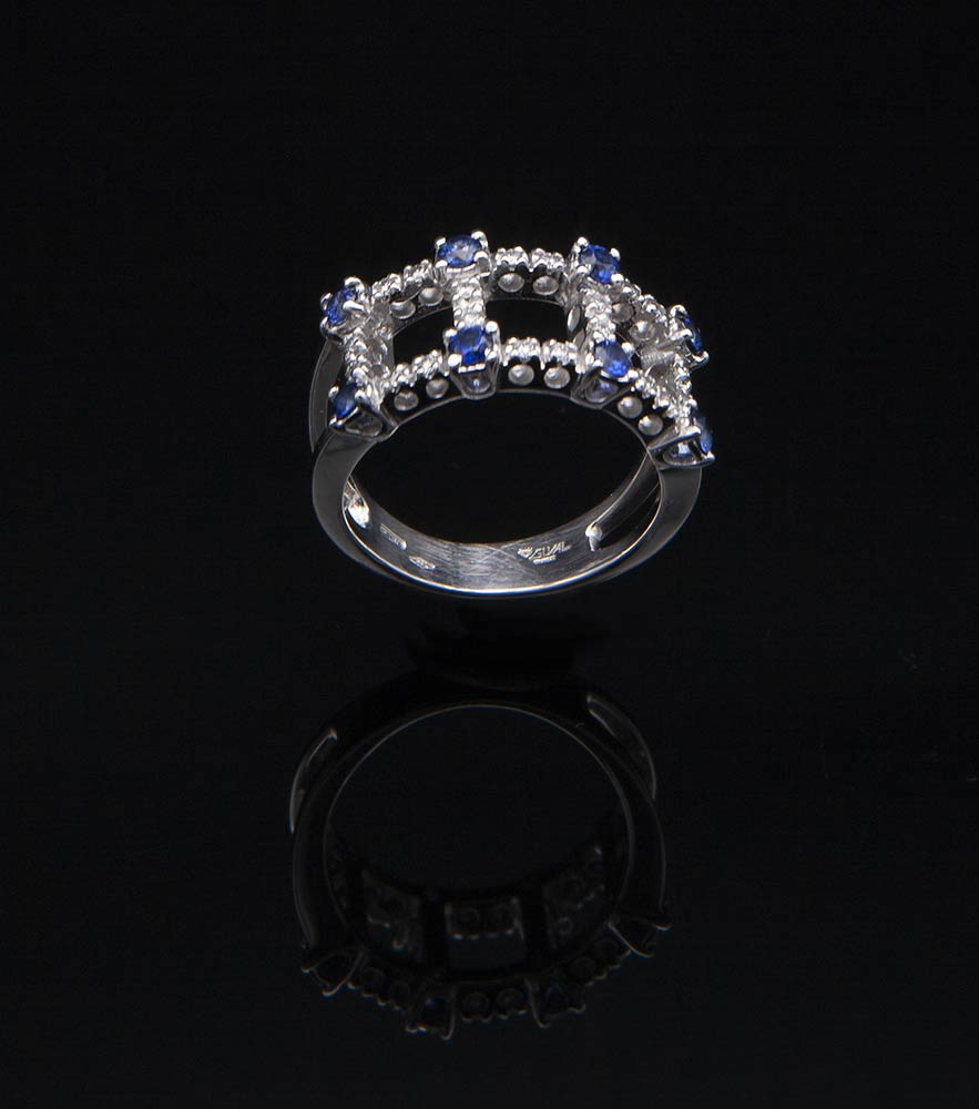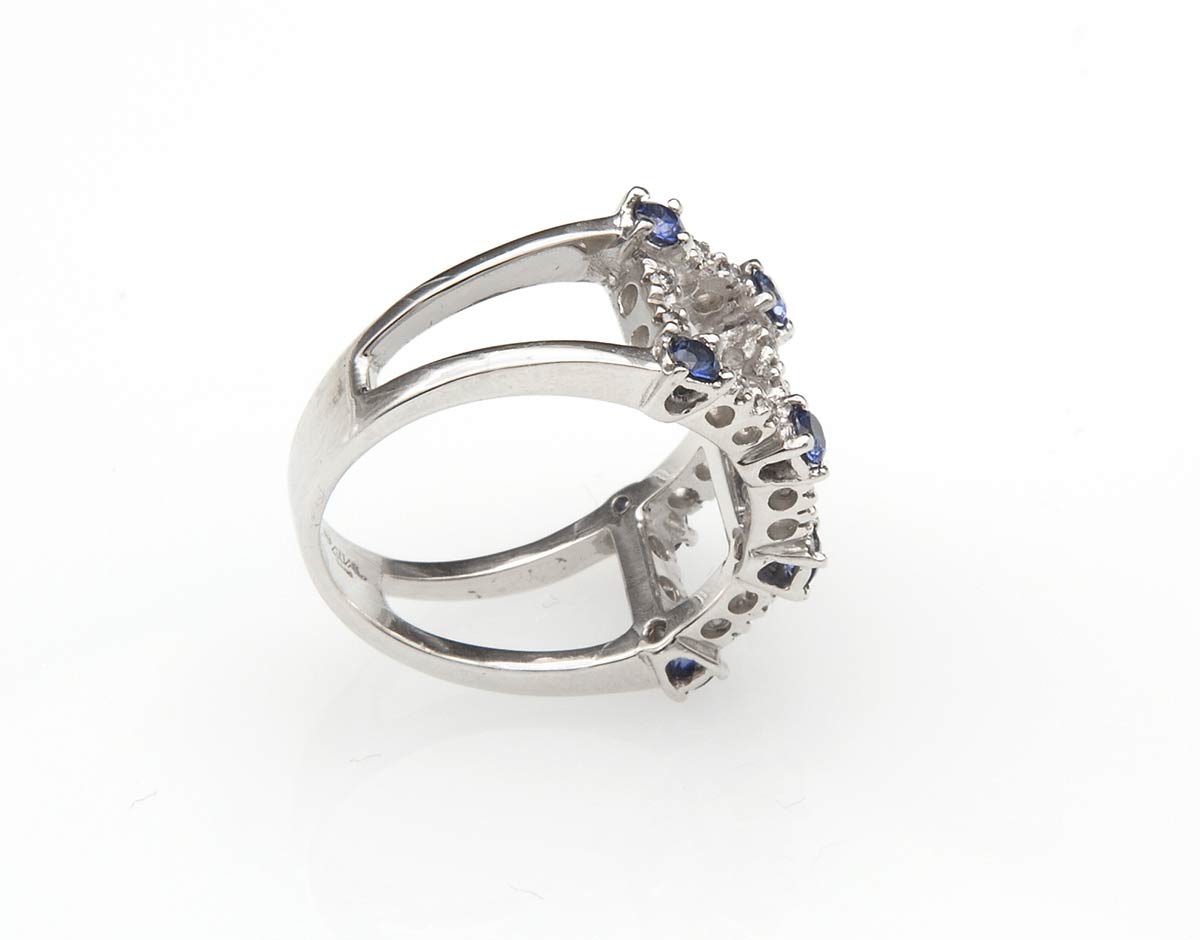 in oro bianco 18k con diamanti taglio brillante e zaffiri. Diamanti taglio brillante 0,20 ct ca., G, VVS; zaffiri 0,50 ct ca. Punzonato "750", "1371 AL", "GIVAL Gioielli". Larghezza 11 mm. Misura IT 16 - US 7,5. Peso 6,6 gr. Stato di conservazione: ***** ottimo.