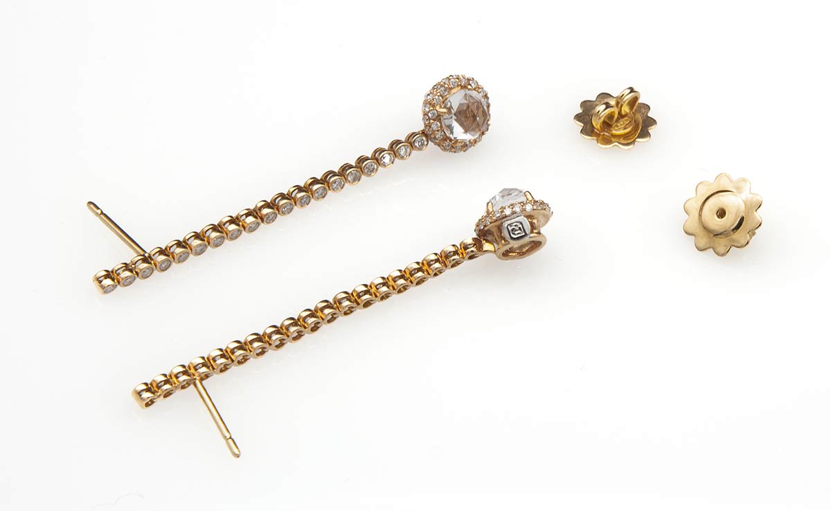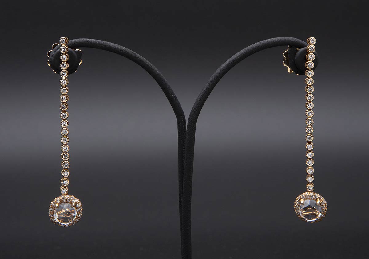 in oro rosa 18k con diamanti e pietra incolore. Diamanti taglio brillante 1,30 ct ca., G-H, VVS-VS. Punzonati "121 BO 750". Lunghezza 5,5 cm. Peso 6,8 gr. Stato di conservazione: ***** ottimo.