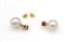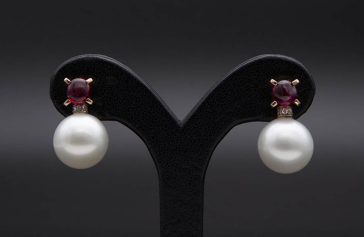 in oro giallo 18k, con perle Australiane sormontate da diamanti taglio brillante per totali 0,10 ct ca., G, VVS e cabochon di spinello rosso 2,00 ct ca. Diametro perle 13,5 - 14 mm. Punzonati "750". Dimensioni 25 x 15 mm. Peso 11,6 gr. Stato di conservazione: ***** ottimo.