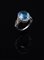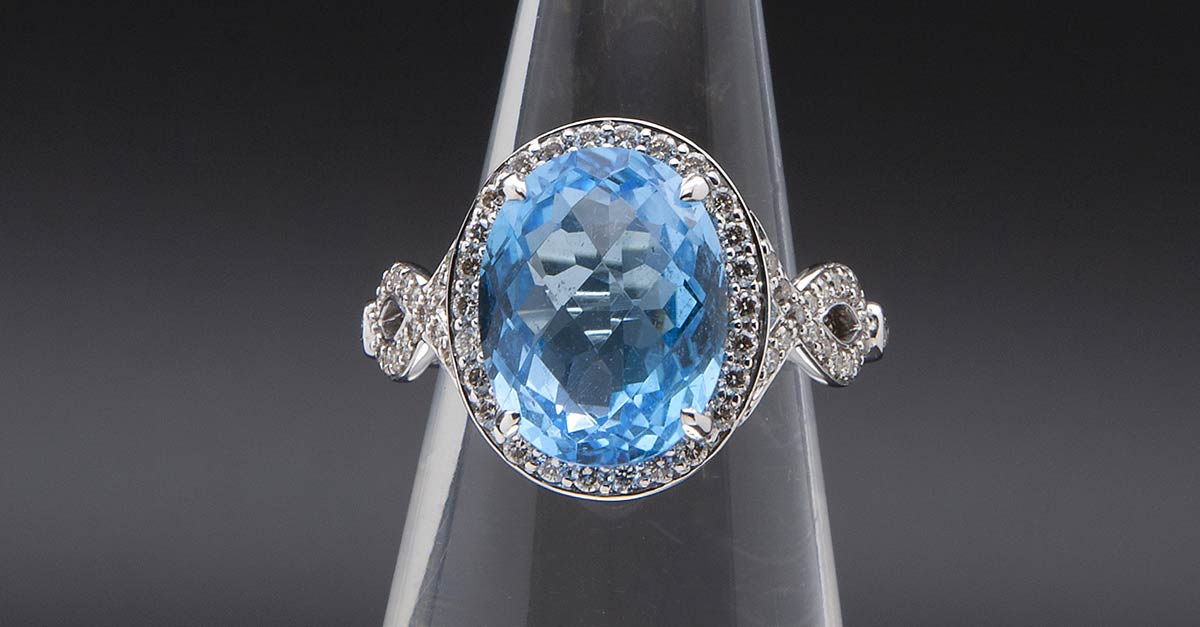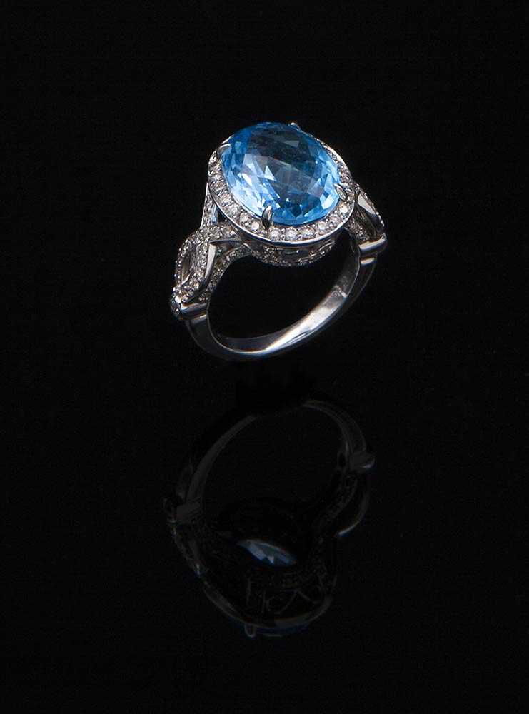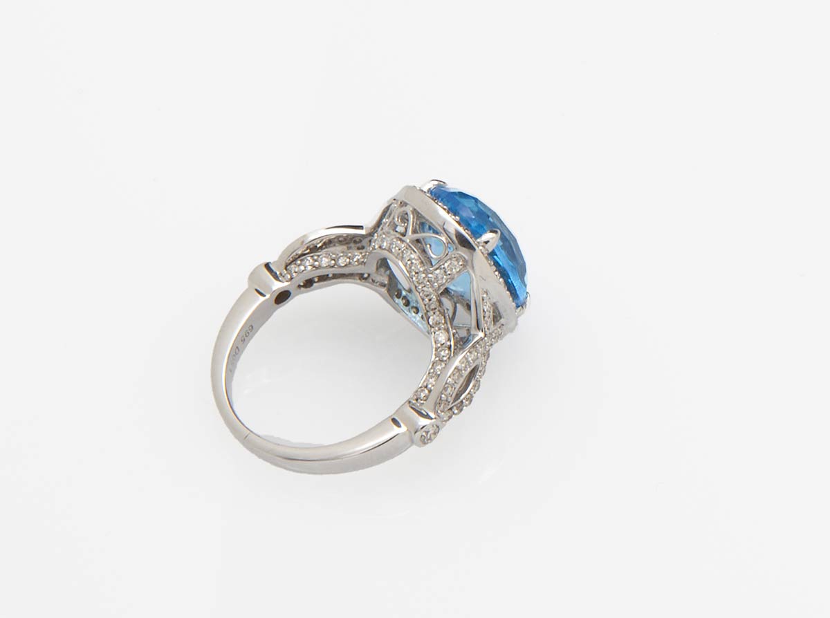 in oro bianco 18k con topazio azzzurro centrale contorno di diamanti. Toapazio ovale taglio sfaccettato 6,95 ct ca., diamanti taglio brillante 0,91 ct ca., F-G, VVS. Punzonato "18k" e "750". Dimensioni fronte 25 x 16 mm. Peso 7,3 gr. Misura IT 9 - US 4,75. Stato di conservazione : ***** ottimo.