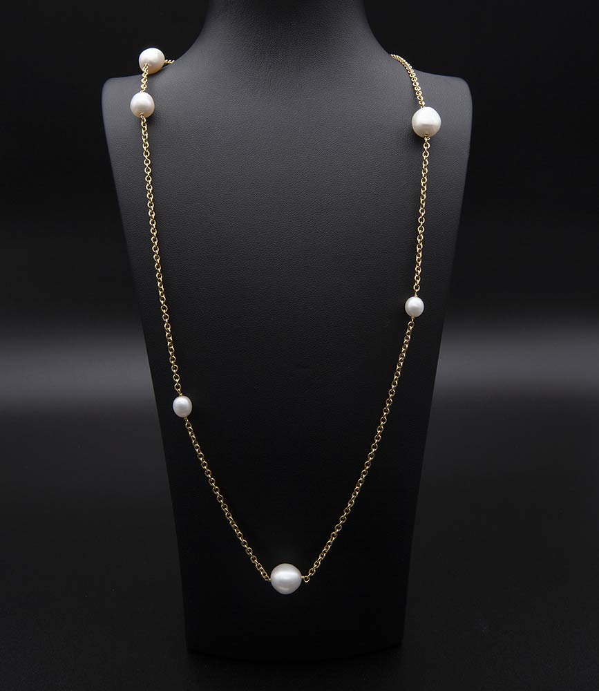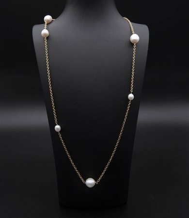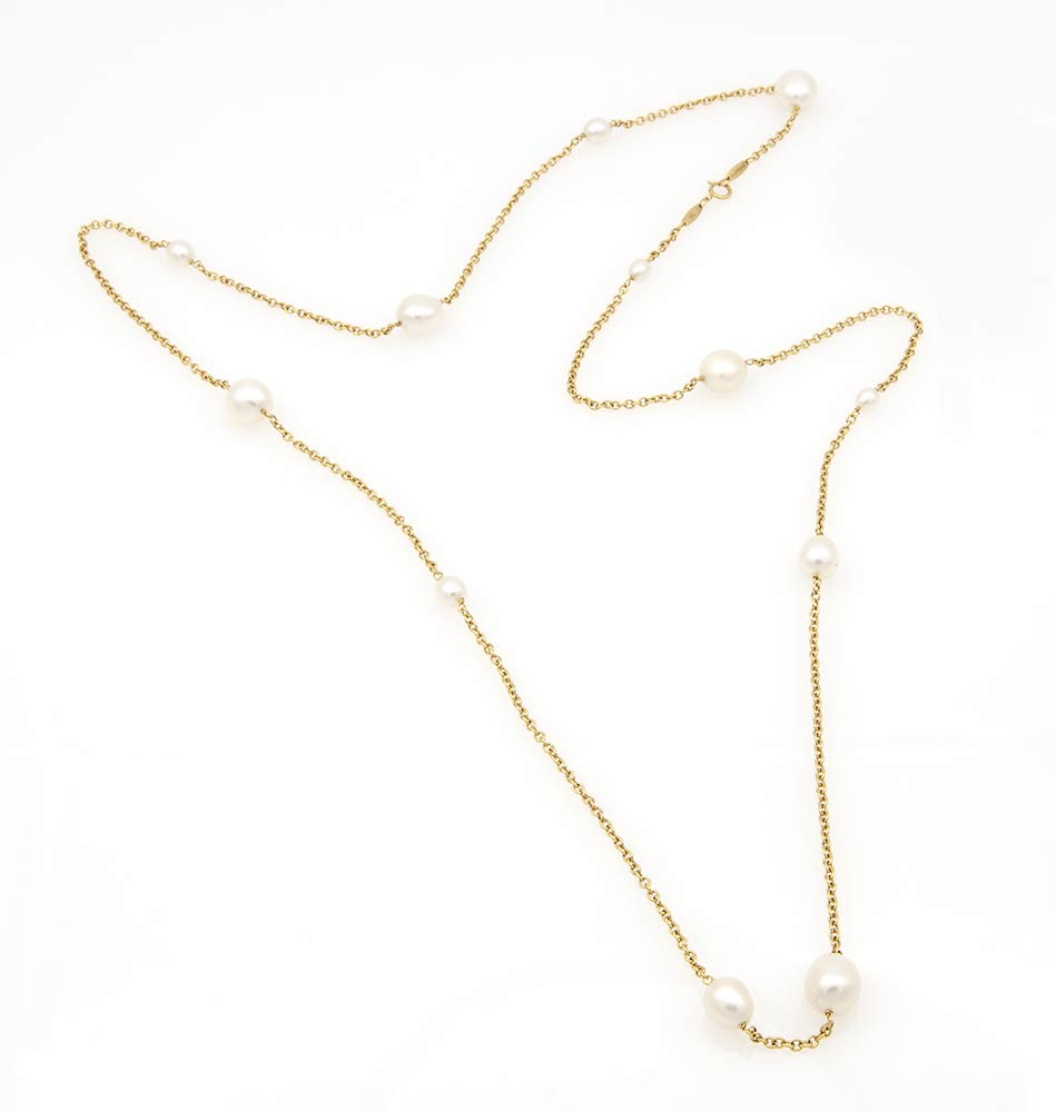 in oro giallo 18k con 12 perle "coltivate d'acqua dolce". Modello "Sprinkle Pearls by the Yard" di Elsa Peretti. Punzonata "750", "1980 MI" e "TIFFANI & CO. Peretti". Diametro perle 10,5 - 8 - 4,5 mm. Lunghezza 89 cm. Peso 20,9 gr. Stato di conservazione: ***** ottimo.