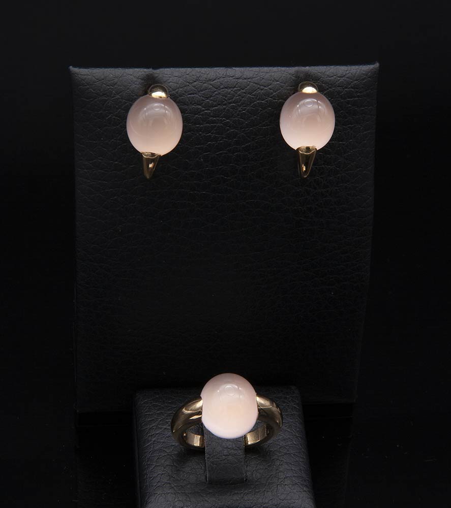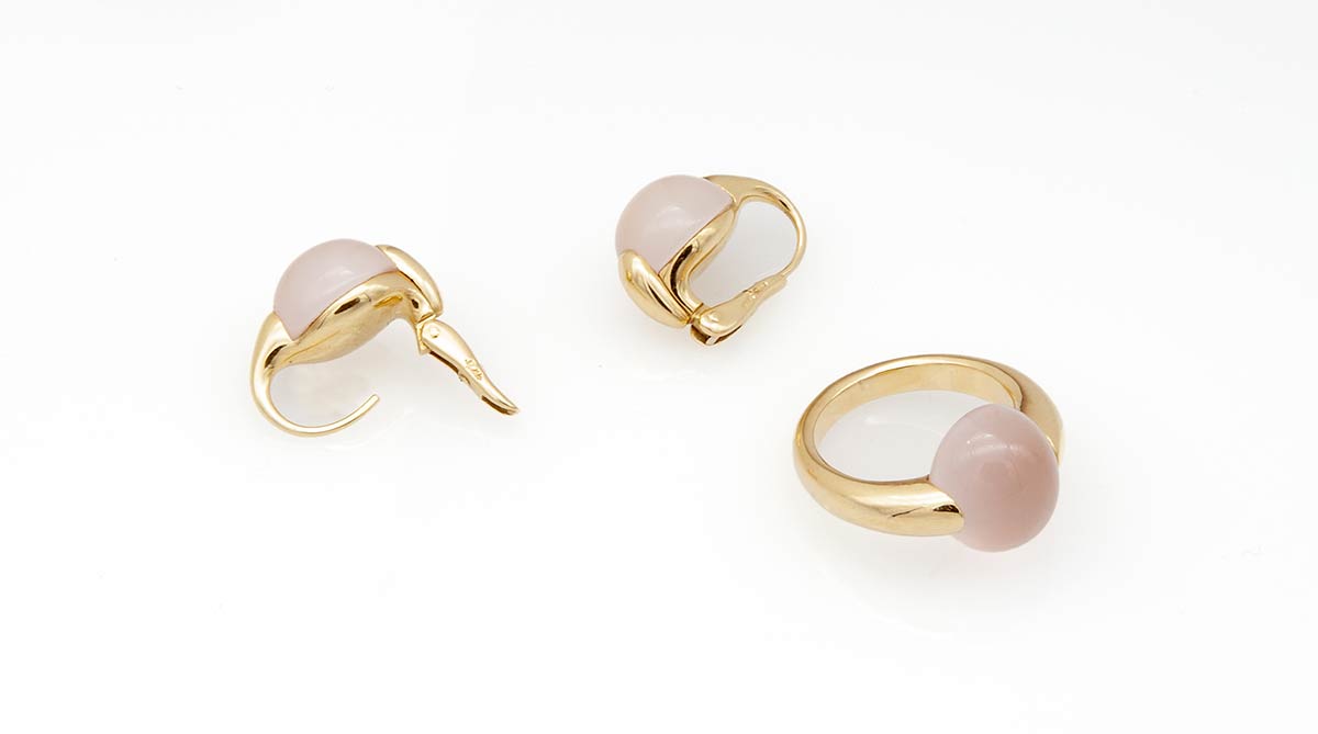 in oro rosa 18k e quarzo rosa. Manifattura "Pomelato", Milano. Collezione "M'Ama Non M'Ama". Punzonato "750" e "1970 AL". Firmato "Pomellato". Misura IT 12 - US 6. Peso 20,4 gr. Stato di conservazione: ***** ottimo.