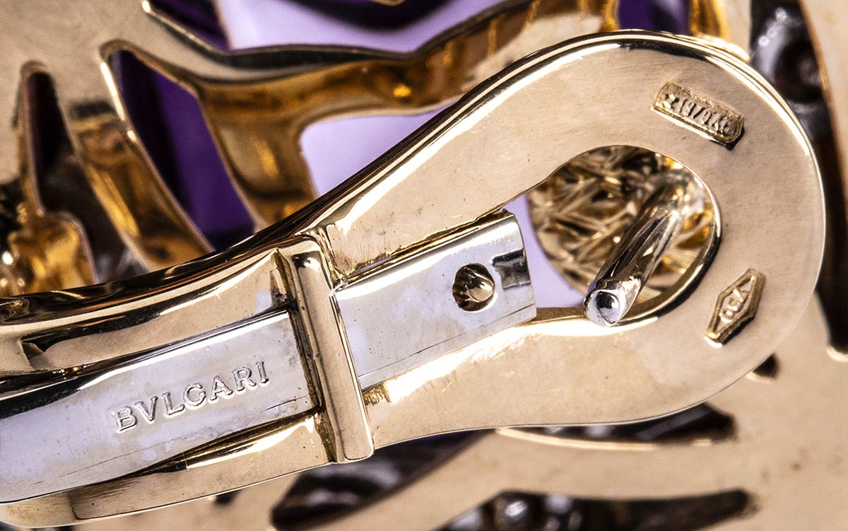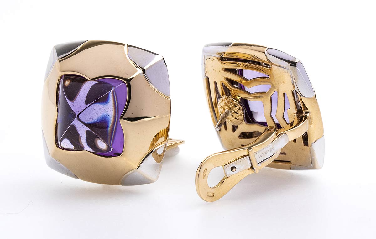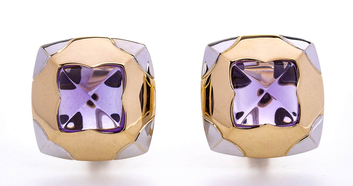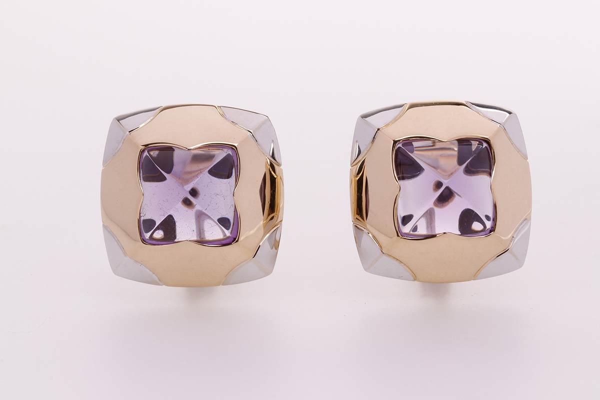in oro bianco e giallo 18k, manifattura "Bvlgari", collezione "Piramide", incastonati con ametista a forma di piramide. Punzonati "750", "1970 AL" and "BVLGARI". Dimensioni frontali 25 x 25 mm. Peso 30,4 gr. Stato di consevazione: ***** ottimo.