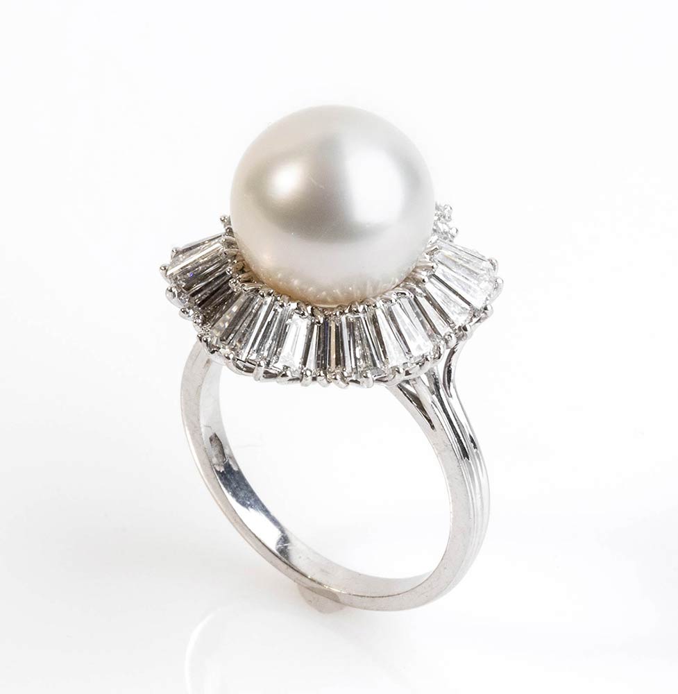 in oro 18k, modello a ballerina con perla "coltivata d'acqua salata" centrale contornata da diamanti taglio tapered 3,50 ct ca., G-H, VVS-VS . Dmensione perla 10,5 - 11 mm. Punzonato "750" e "1258 AL ". Diametro fronte 19 mm. Misura IT 15 - US 7. Peso 8,1 gr. Stato di conservazione: ***** ottimo.