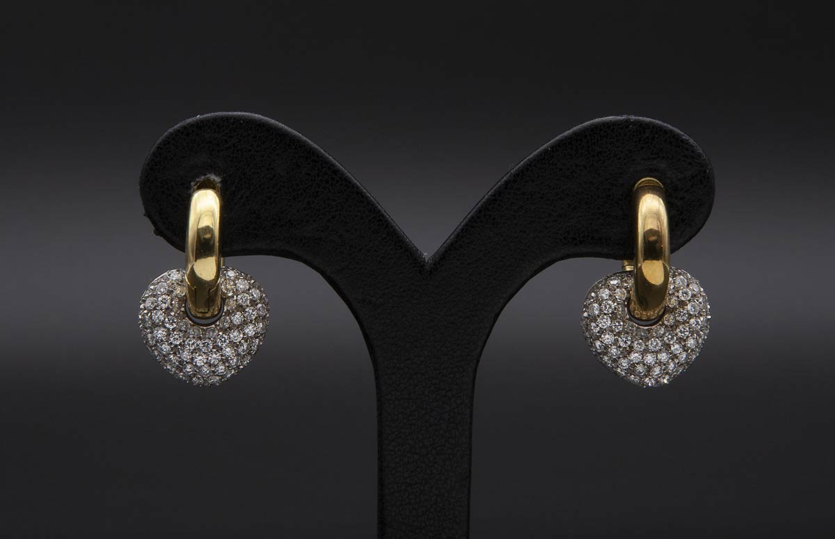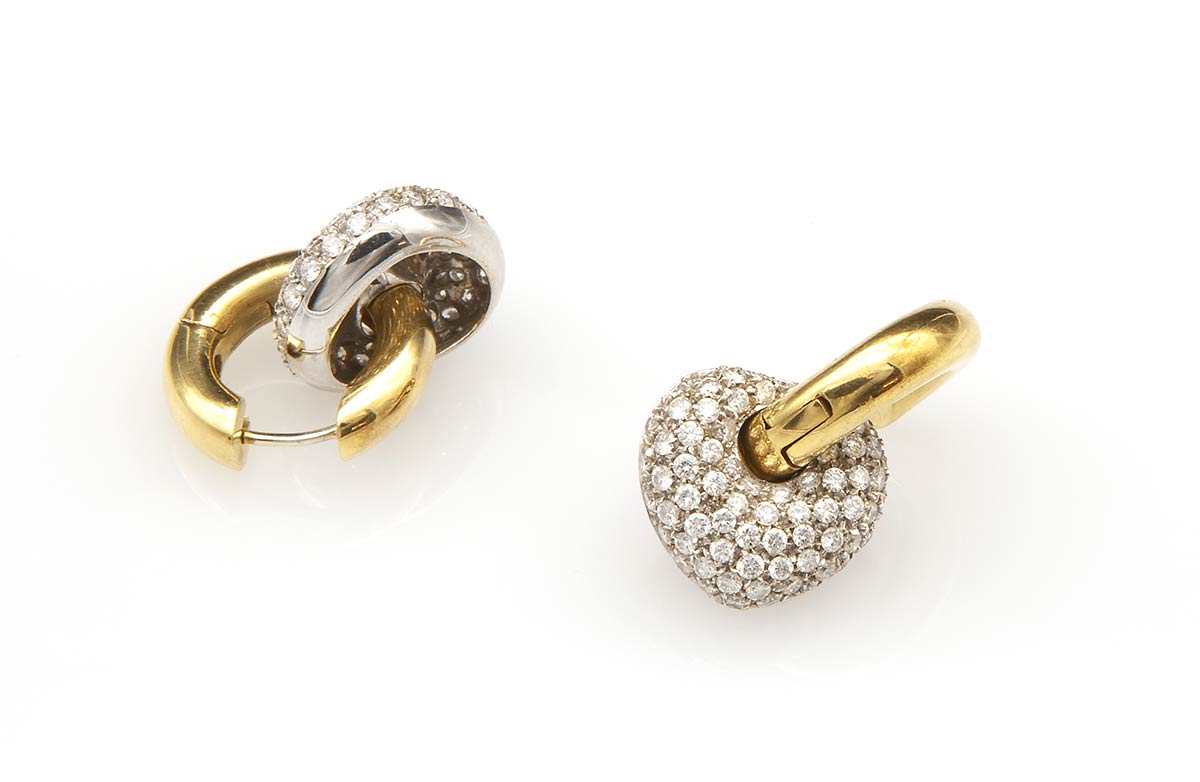 in oro giallo e bianco 18k con elemento a forma di cuore amovibile, incastonato con pavé di diamanti taglio a brillante 2,50 ct ca., F-G, VVS-VS. Punzonati "750" e "2041 AL". Firmati "Leo Pizzo". Dimensioni 15 x 24 mm. Peso 14,9 gr. Stato di conservazione: ***** ottimo.