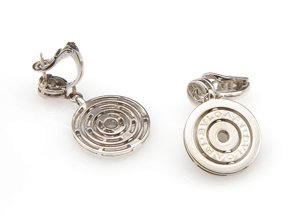 in oro bianco 18k, "Bvlgari", collezione "Bvlgari-Bvlgari". Punzonati "750", "2394 AL" and "Made in Italy". Firmato "Bvlgari". Dimensioni 21 x 35 mm. Peso 23,3 gr. Stato di conservazione: ***** ottimo.