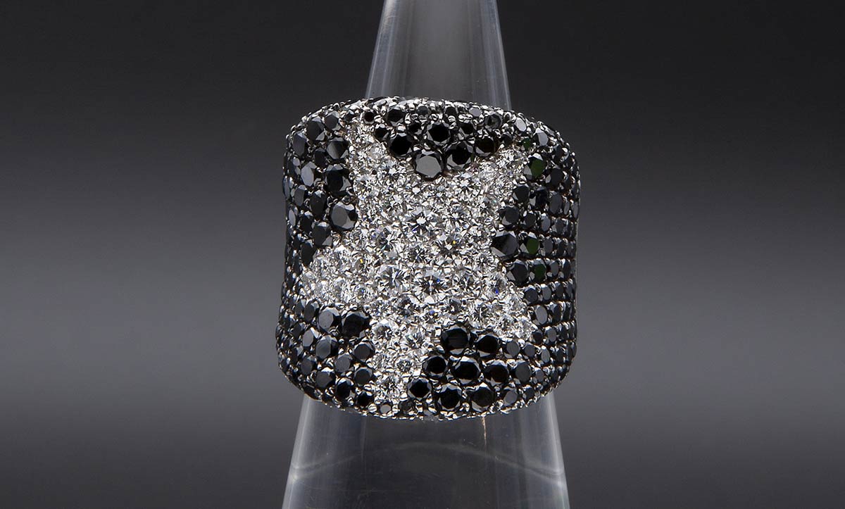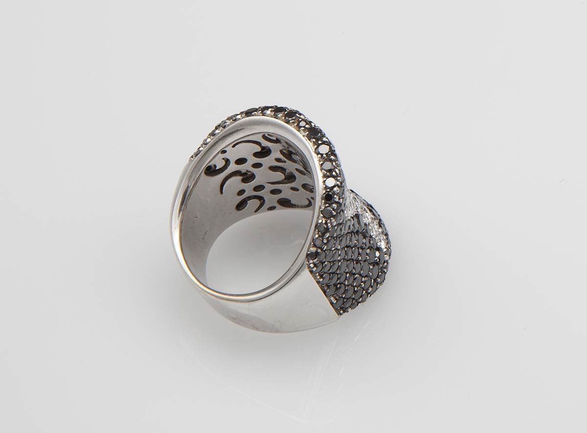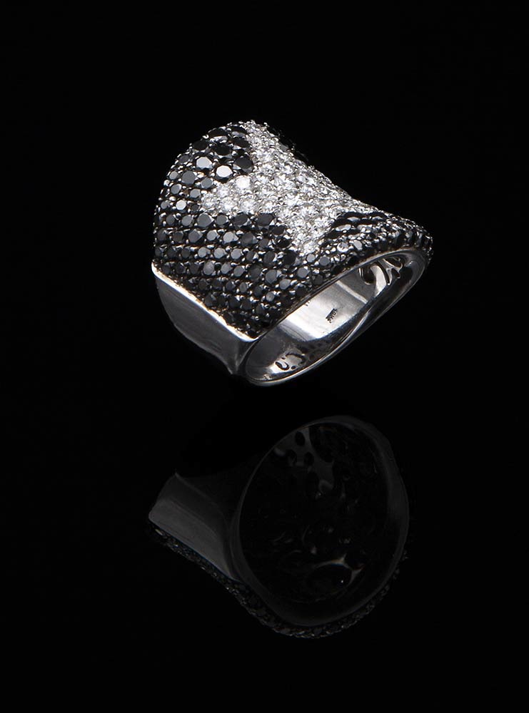in oro bianco 18k con diamanti taglio brillante bianchi e neri. Diamanti bianchi 1,70 ct ca., F-G, VVS-VS. Diamanti neri 2,50 ct ca. Dimensioni 24 x 22 mm. Punzonatura "750", "18 kt" e "Italy". Peso 23,3 gr. Misura IT 14 - US 7. Stato di conservazione: ***** ottimo.