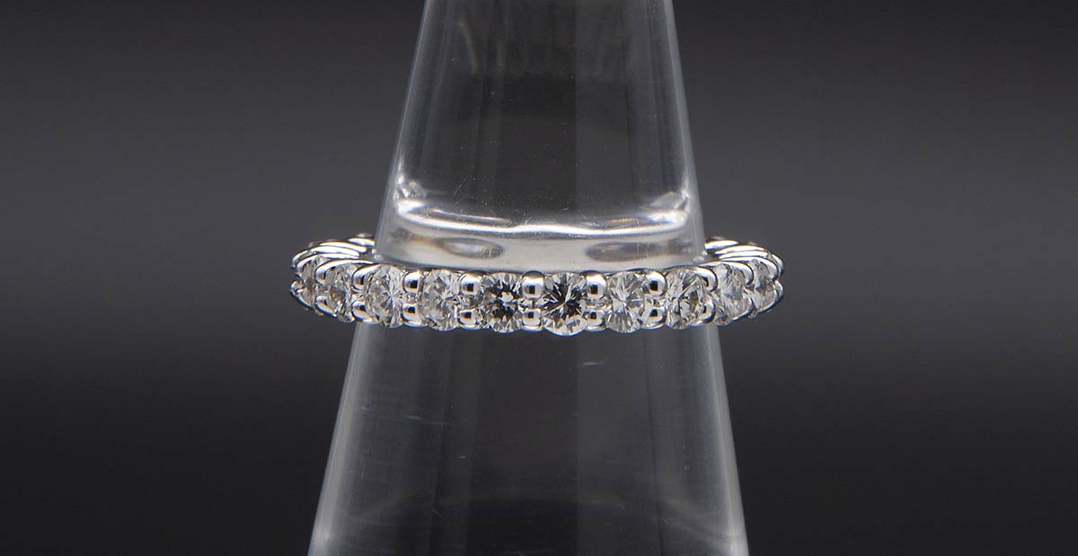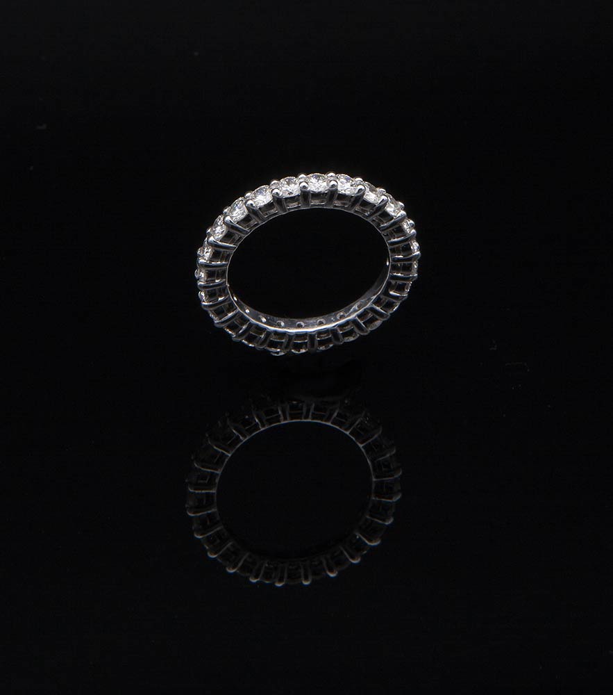 realizzato in oro bianco 18k, modello "eternity" incastonato con linea di diamanti taglio brillante 2,00 ct ca., F-G, IF-VVS. Dimensioni 14 x 16 mm. Misura IT 13 - US 6,5. Peso 4 gr. Stato di conservazione: ***** ottimo.