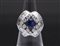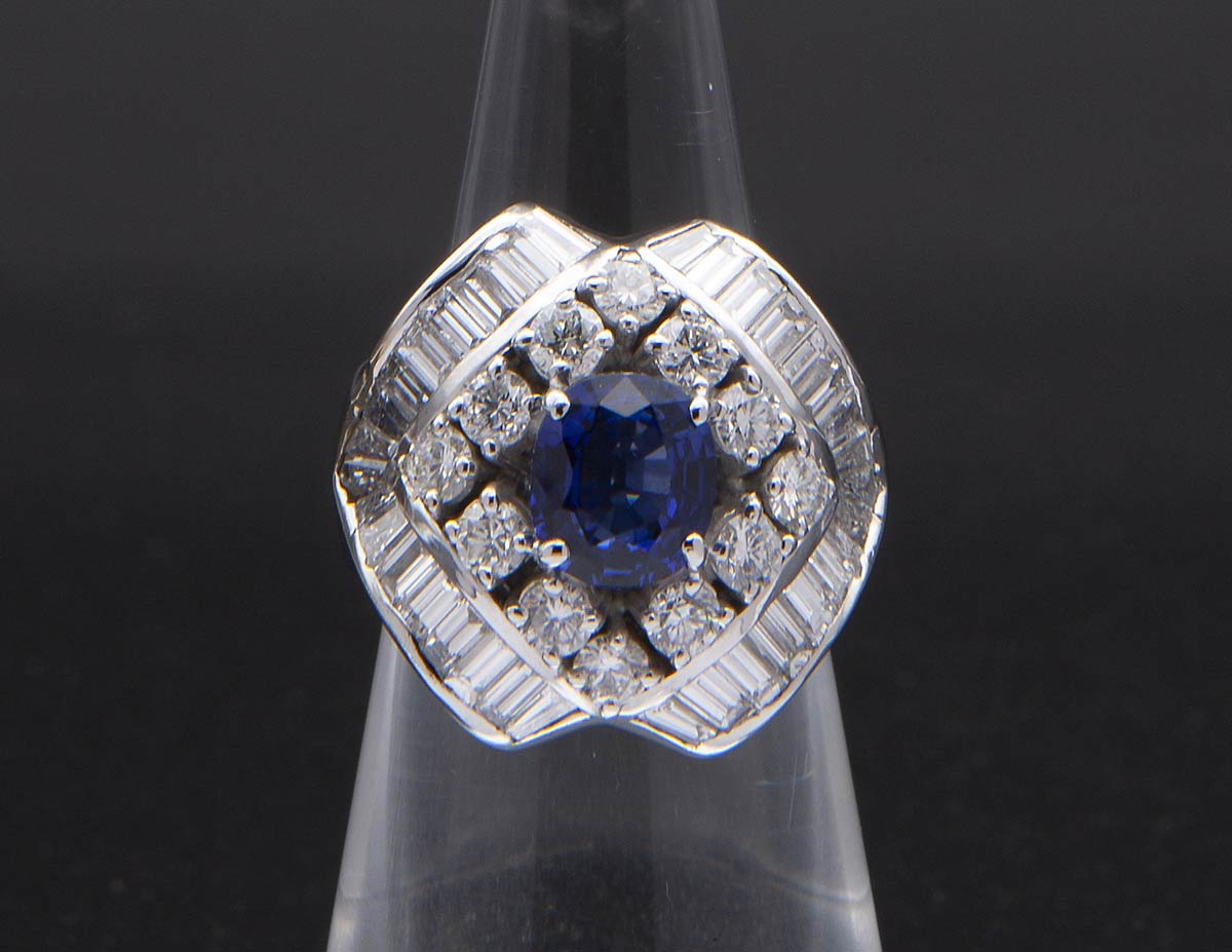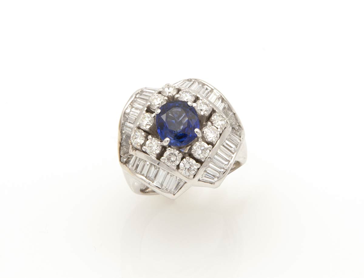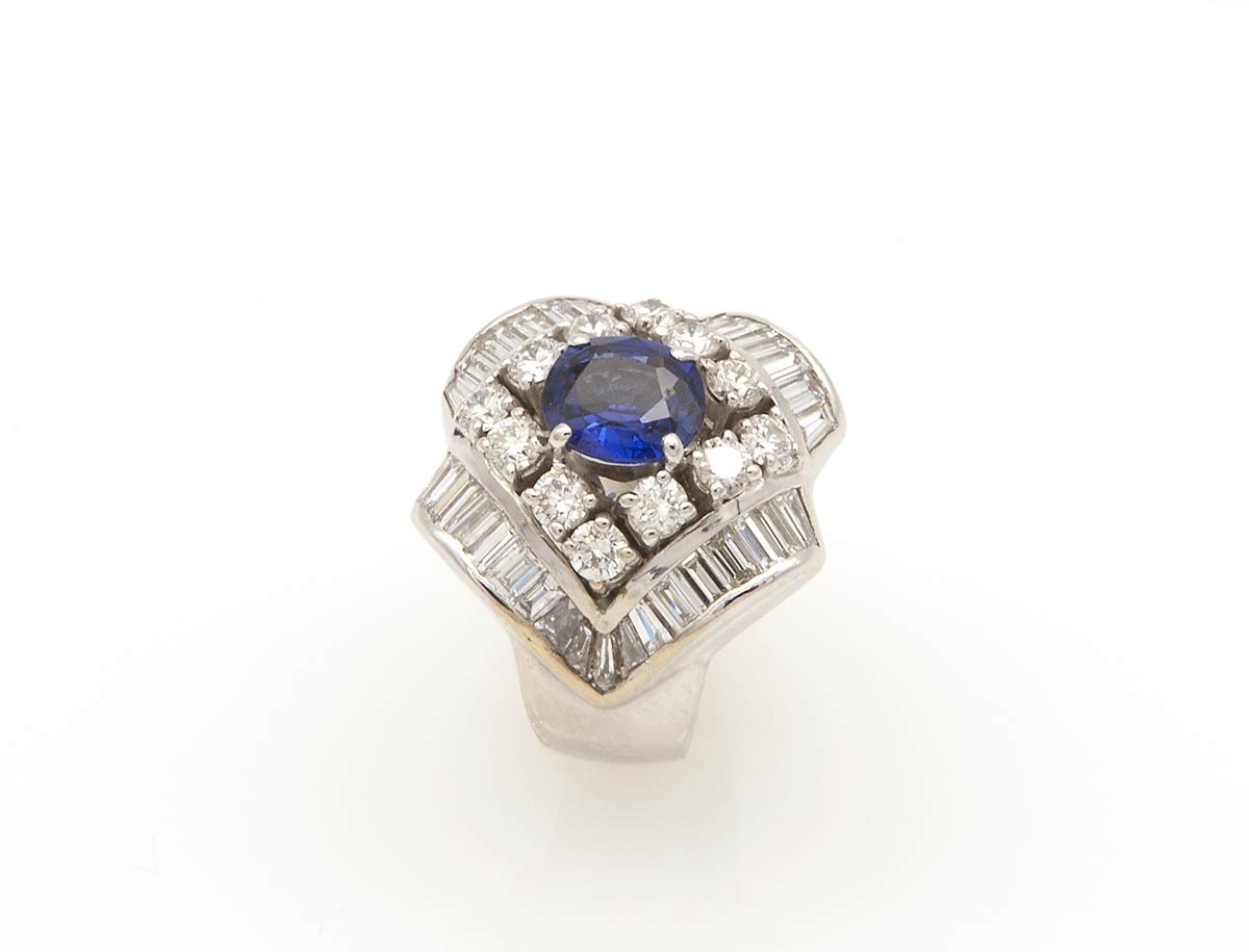 in oro bianco 18k con zaffiro contornato da diamanti. Zaffiro 1,70 ct ca., diamanti taglio brillante e taglio baguette 3,40 ct ca., F-H, VVS. Punzonato "750". Dimensioni fronte 20 x 21 mm. Peso 14,8 gr. Misura IT 11,5 - US 5,75. Il lotto è accompagnato da perizia tecnica Istituto Gemmologico Nazionale I.G.N. Stato di conservazione: ***** ottimo.