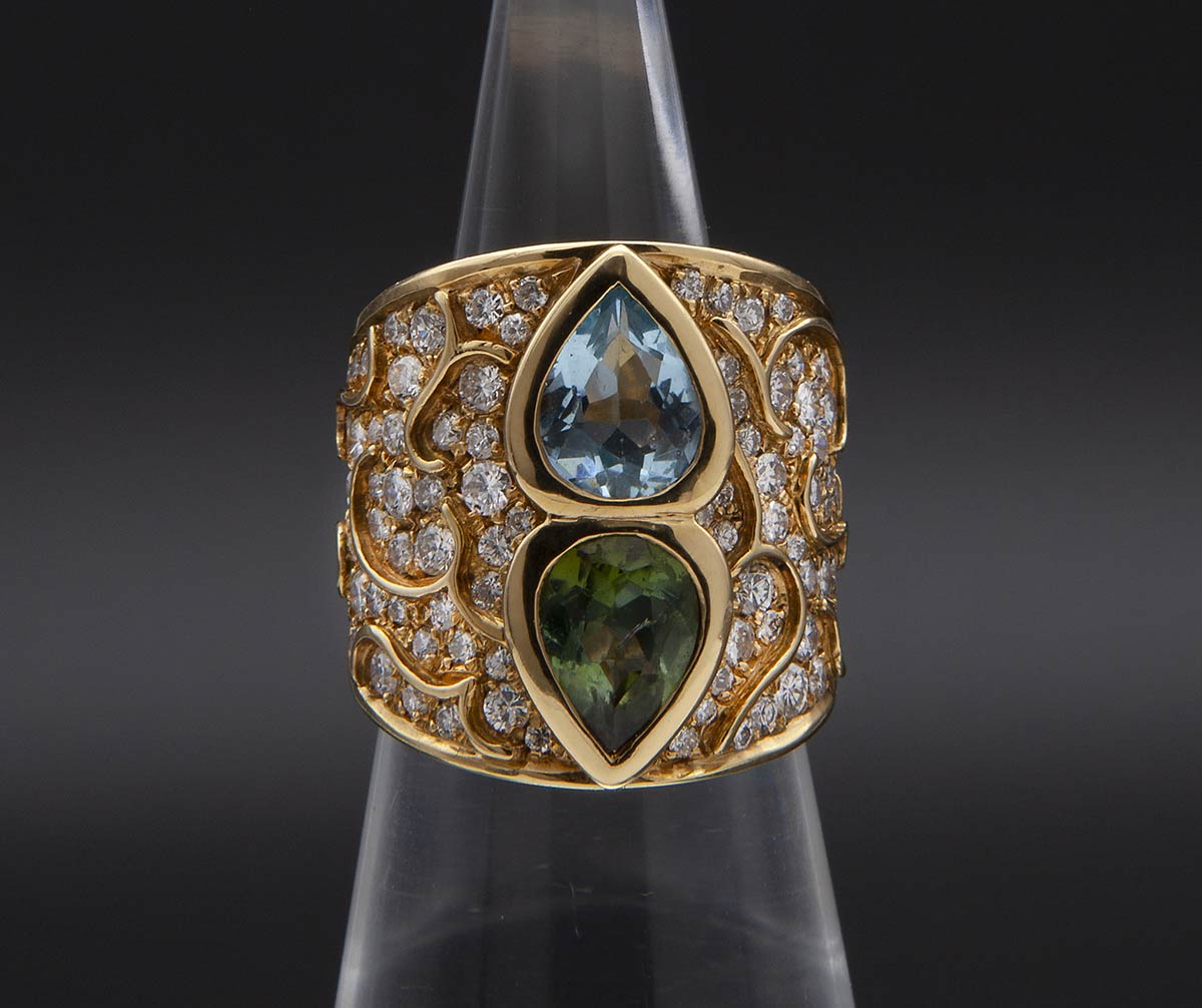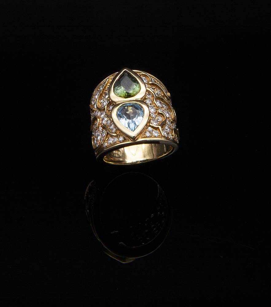 in oro giallo 18k, modellato come una fascia, incastonato con coppia di gemme di colore di forma a goccia contornate da pavé di diamanti taglio brillante 2,50 ct ca., F-G, VVS-VS. Firmato "Marina B". Punzonato "750", "26 AL" e "MARINA B". Larghezza 38 mm. Misura IT 12 - US 6. Peso 14,8 gr. Stato di conservazione: ***** ottimo.