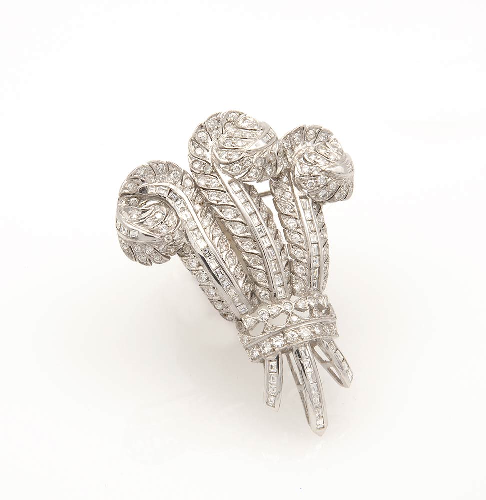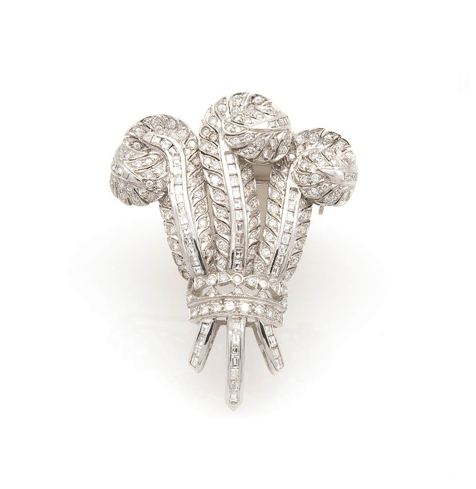 realizzata in oro bianco 18k, replica della spilla "principe del Galles" commissionata e regalata dal principe Edoardo Windsor alla sua amata Wally Simpson nel 1935, raffigurante tre piume in pavé di diamanti tenute insieme da una corona. Diamanti taglio brillante, baguette e carré 3,10 ct ca., G-H, VVS-SI. Peso 17.1 g. Dimensioni 37 x 49 mm. Punzonata "750". Il lotto è accompagnato da perizia tecnica Istituto Gemmologico Nazionale I.G.N. Stato di conservazione: ***** ottimo.