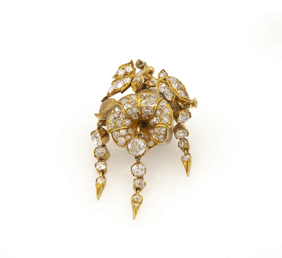 in oro 18k con diamanti taglio vecchio europeo 7,30 ct ca., G-H, VVS-SI. Gioiello vintage realizzato a mano da maestri orafi Italiani. Dimensioni 28 x 50 mm. Peso 10,8 gr. Il lotto è accompagnato da perizia tecnica Istituto Gemmologico Nazionale I.G.N. Stato di conservazione: ***** ottimo.