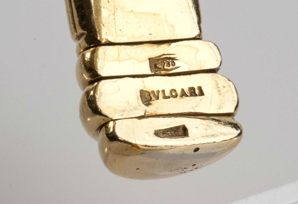 in oro giallo 18k, "Bvlgari", anni '70. Firmato 'Bvlgari". Diametro 6,5 cm. Larghezza 8 mm. Punzonato "750", "2337 AL" e "BVLGARI". Peso 47.6 gr. Stato di conservazione: ***** ottimo.