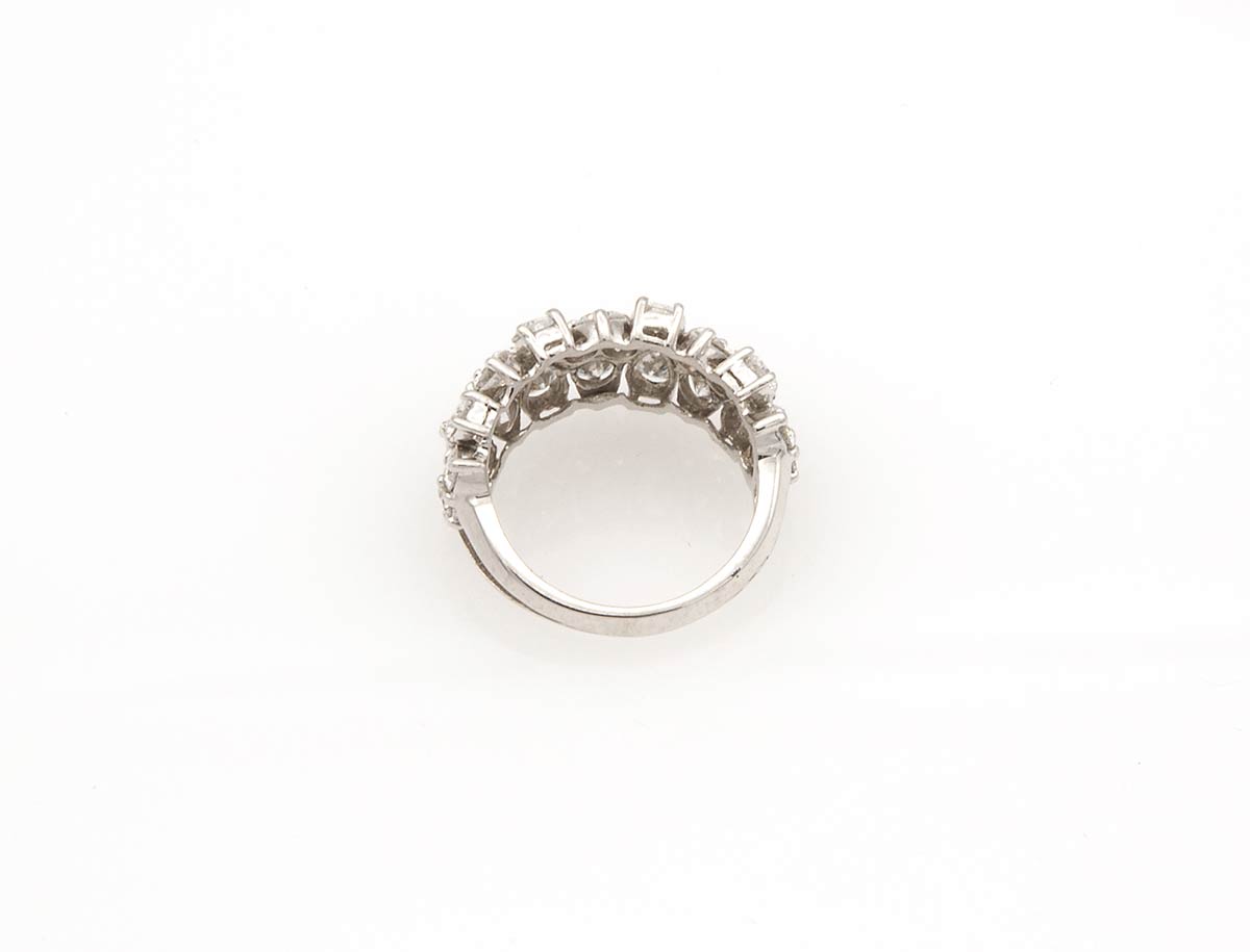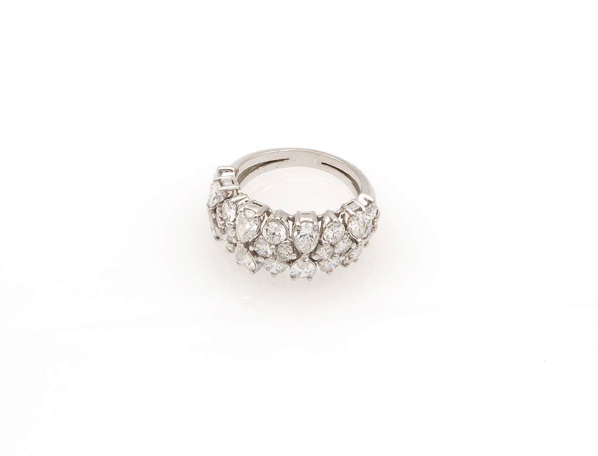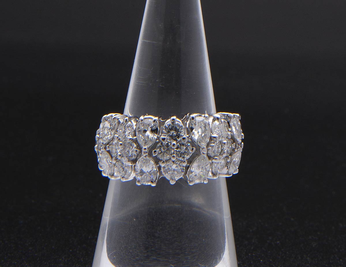 Anello in oro bianco 18k con diamanti taglio a goccia e taglio brillante 3,50 ct ca., G-H, VS-SI. Dimensioni fronte 10,5 x 23 mm. Misura IT 13 - US 6,75. Peso 6,9 gr. Il lotto è accompagnato da perizia tecnica Istituto Gemmologico Nazionale I.G.N. Stato di conservazione: ***** ottimo.