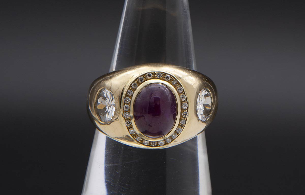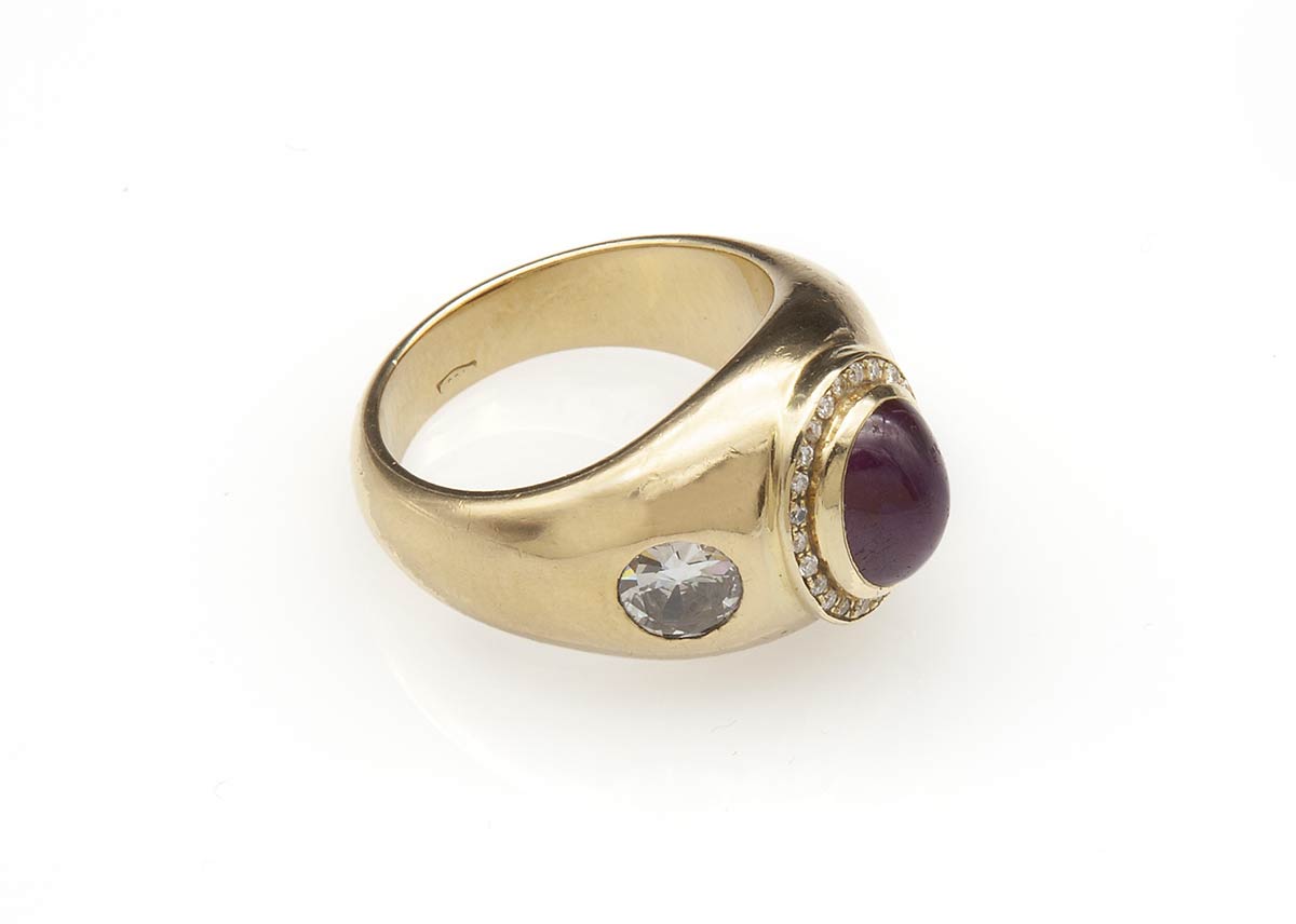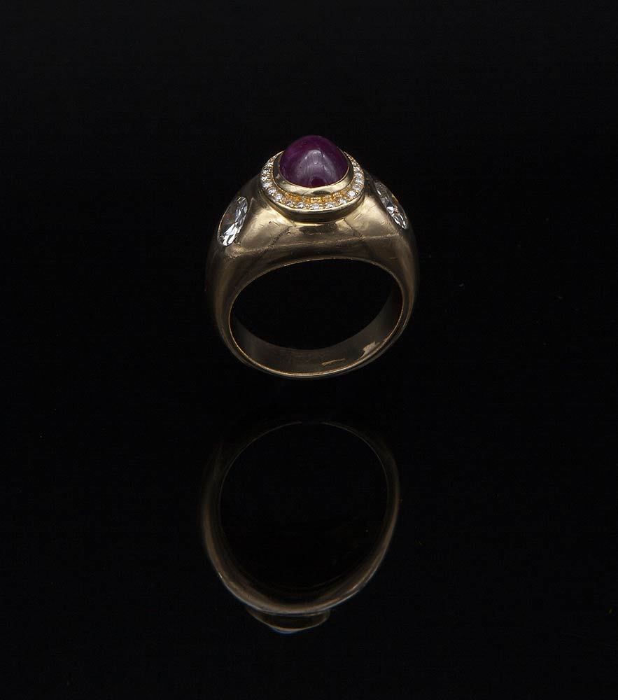 in oro giallo 18k, modellato come una fascia, incastonato con rubino birmano di forma ovale, taglio cabochon 3,00 ct ca. affiancato da coppia di diamanti taglio brillante 1.40 ct ca., L-M, VS-SI e contornato da piccoli diamanti 0,10 ct ca. Punzonato "750". Peso 22,4 g. Misura IT 19 - US 8,75. Il lotto è accompagnato da perizia tecnica Istituto Gemmologico Nazionale I.G.N. Stato di conservazione: ***** ottimo.