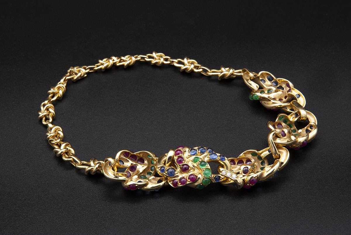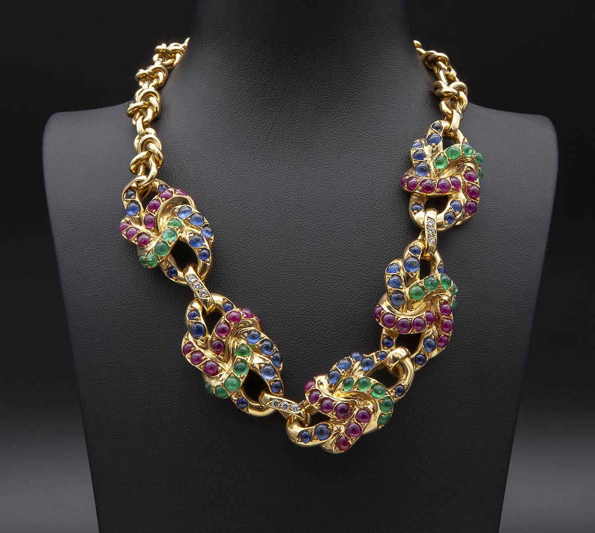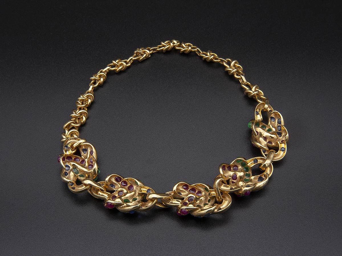 in oro giallo 18k, anni '70, incastonato con smeraldi, zaffiri e rubini cabochon per un peso totale di 12 ct ca. Straordinaria manufattura artigianale "Moroni". Firmato "Moroni". Punzonato "750" e "350 ROMA". Peso 92,8 gr. Lunghezza 39 cm. Stato di conservazione: ***** ottimo.