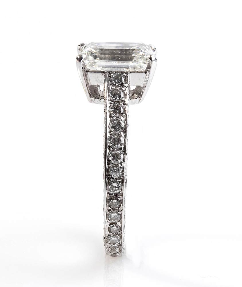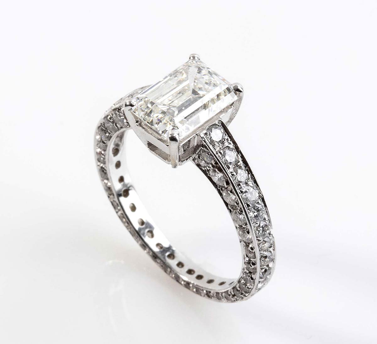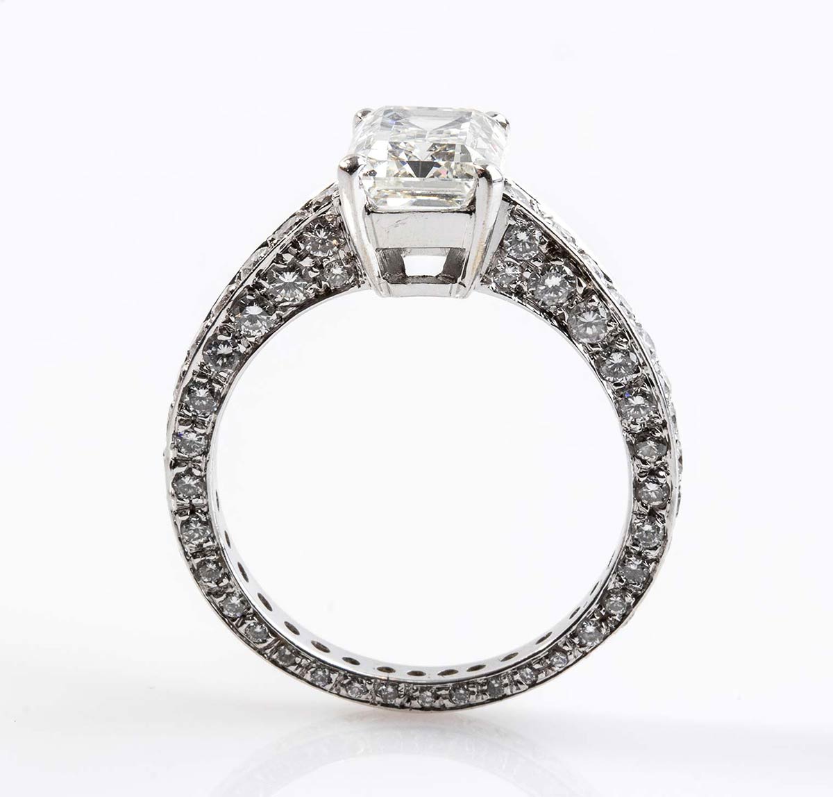 in oro bianco 18k, incastonato con diamante ottagonale, taglio a gradini 2,41 ct ca., lati della montatura incastonati con pavé di piccoli brillanti 2,00 ct ca. Dimensioni fronte 22 x 7 mm. Peso 3,8 gr. Misura IT 14 - US 6,25. IL lotto è accompagnato da certificato IGI (Istituto Gemmologico ITliano) di Roma. Stato di consevazione: ***** ottimo.