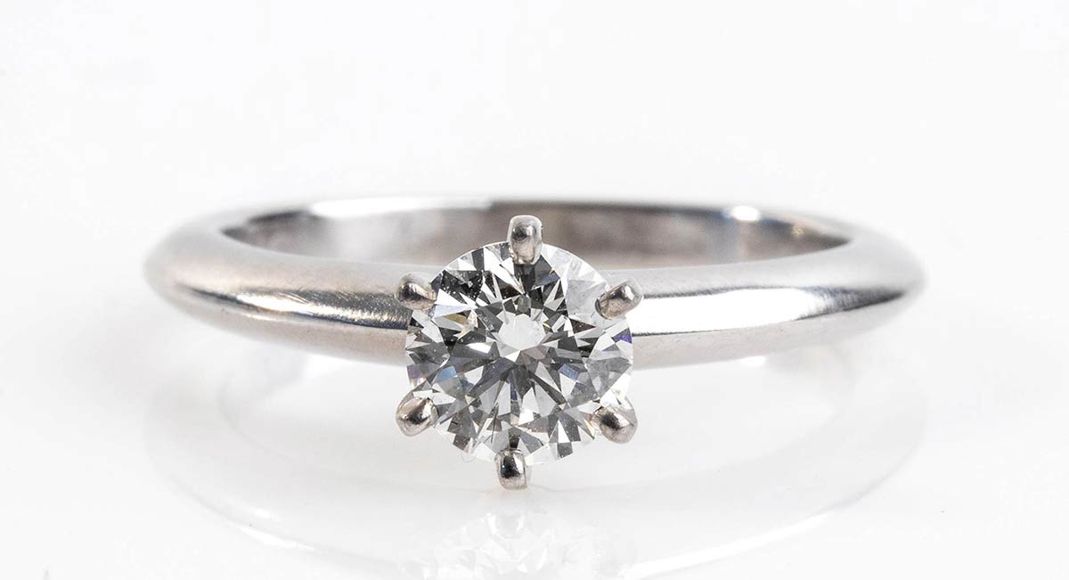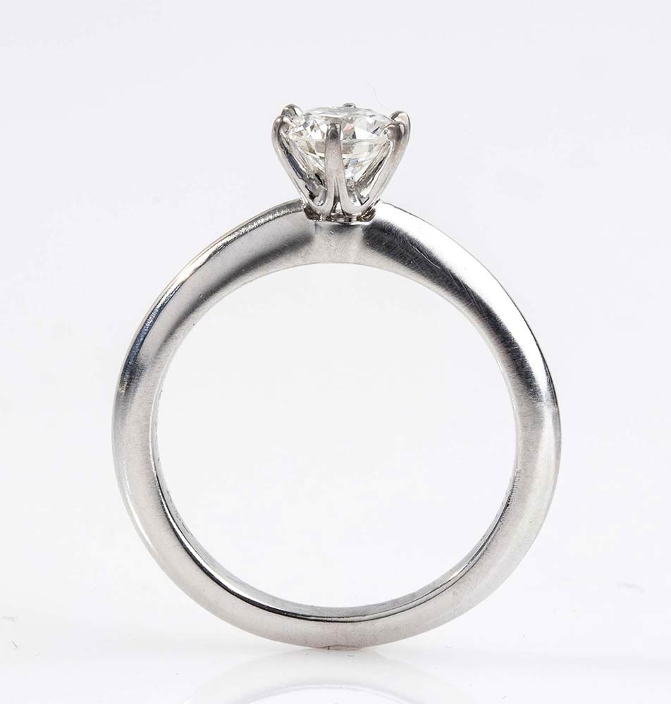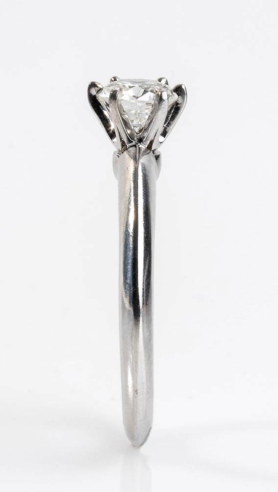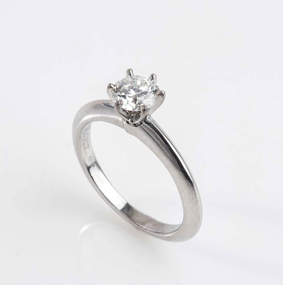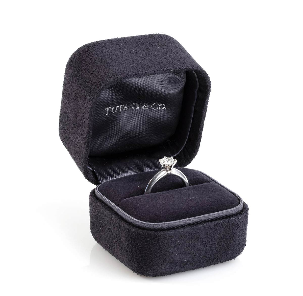 realizzato in platino, con diamante taglio brillante 0,53 ct ca., I, VVS. Corredato di certificato TIFFANY. Punzonato "PT950", "37800708", "D 0,53 ct" e "Tiffany & Co". Peso 4,1 gr. Misura IT 13 - US 6. Stato di consevazione: ***** ottimo.