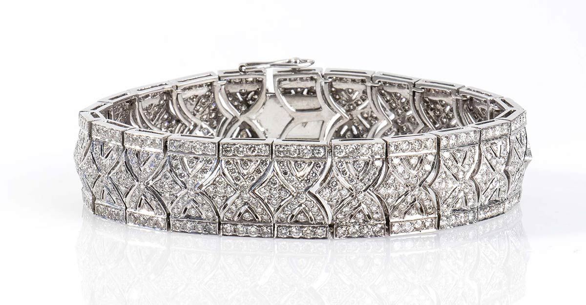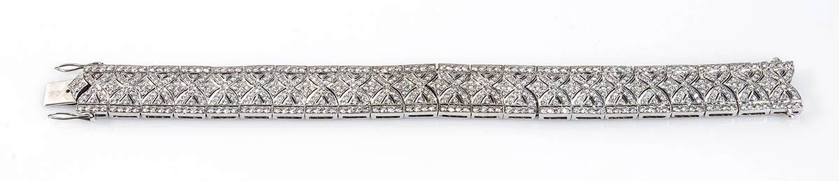 in oro bianco 18k, a maglie rigide articolate, incastonato con diamanti taglio brillante 8,00 ct ca., G-H, VVS-VS. Punzonato "750". Lunghezza 18 cm. Peso 46,5 gr. Stato di consevazione: ***** ottimo.