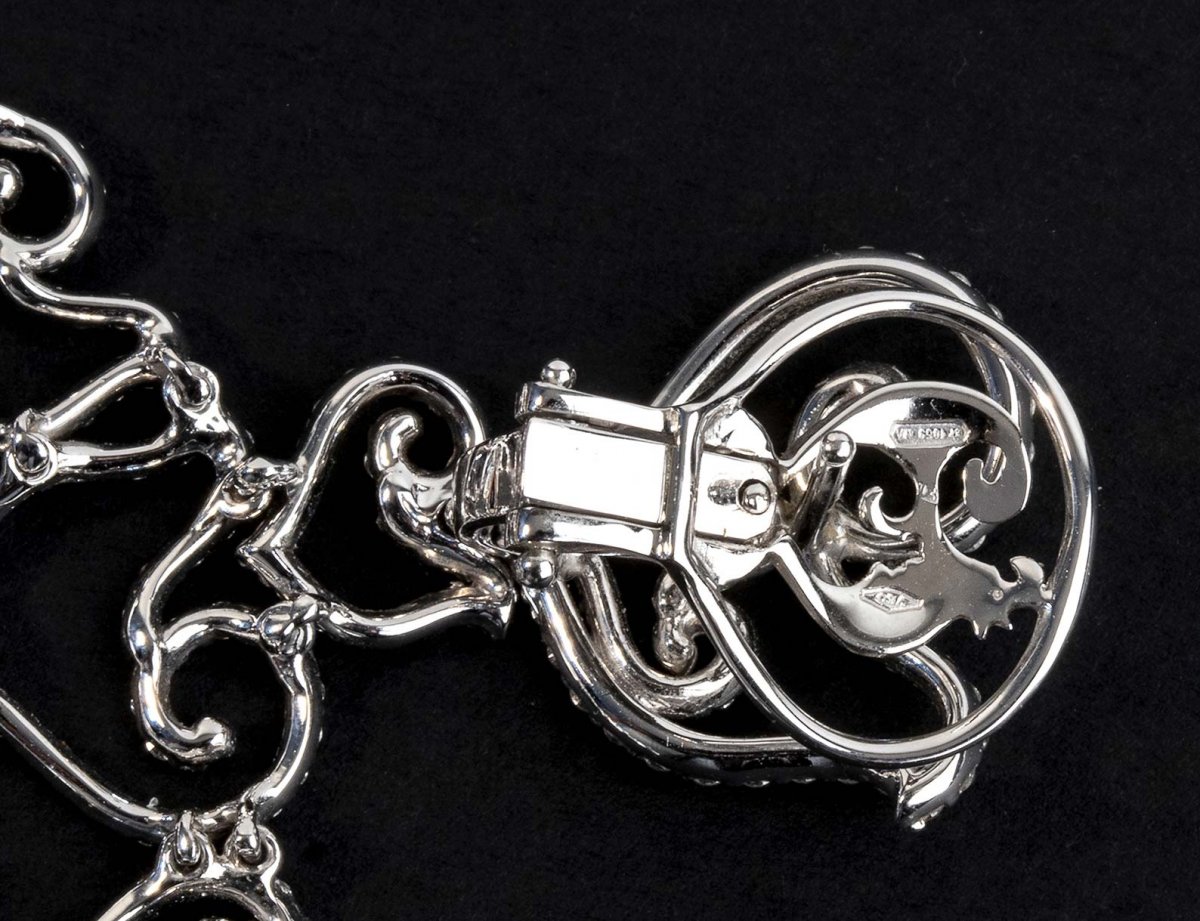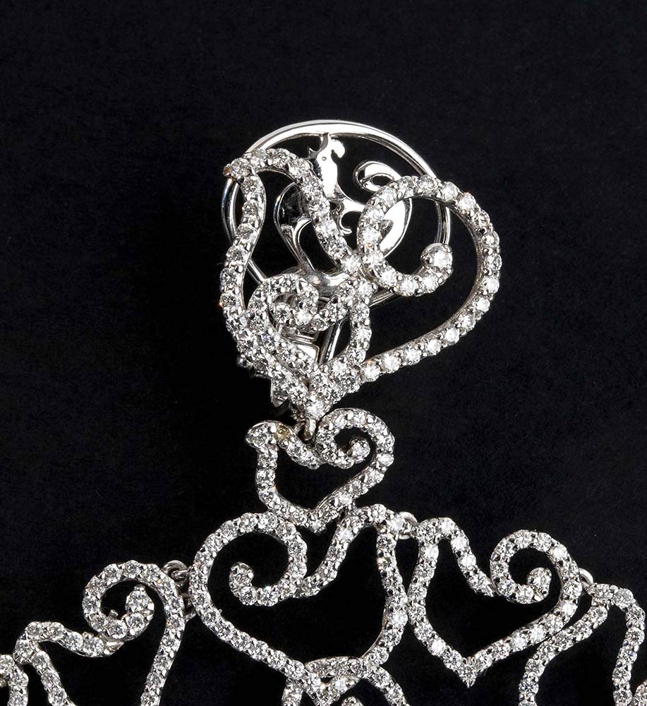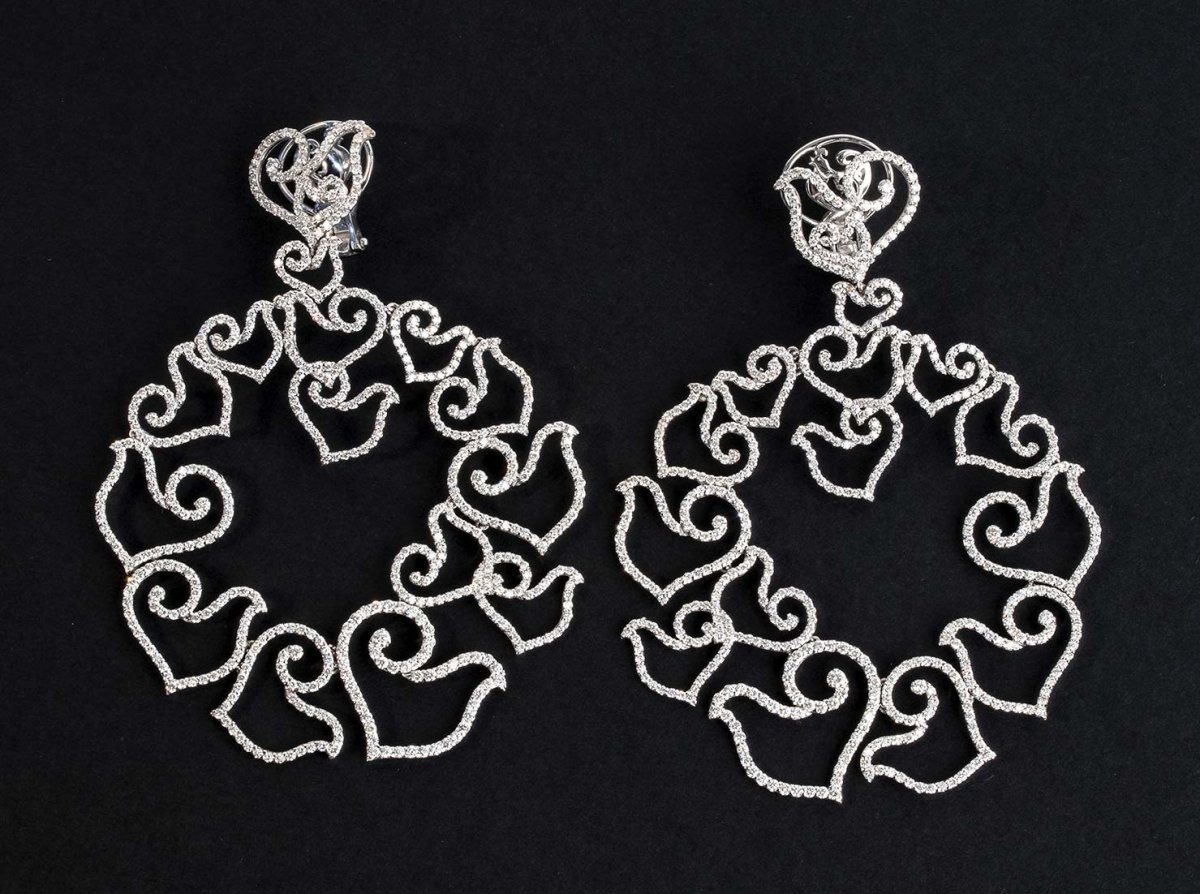 in oro bianco 18k, incastonati con diamanti taglio brillante 10,00 ct ca., D-E, VVS. Diametro 9 cm. Peso 24,1 gr. Stato di consevazione: ***** ottimo.