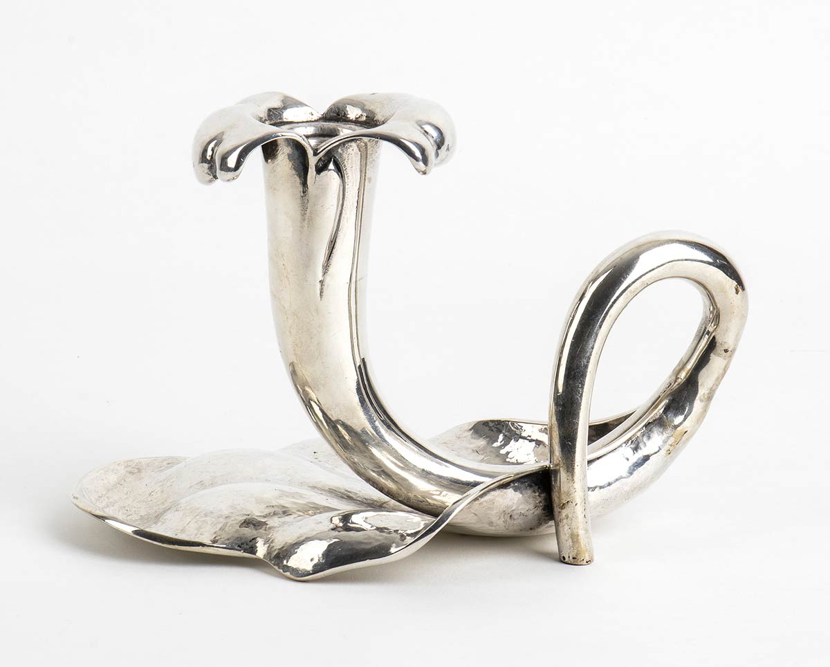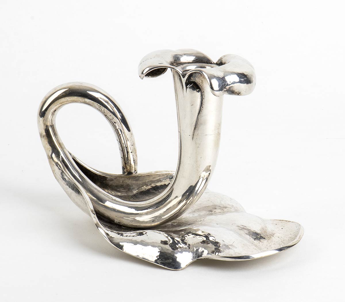 a forma di fiore con presa laterale. Punzonata "800", marchio di fabbrica dal 1945 al 1968 "365 MI" e "Finzi", argentiere Arrigo Finzi, Milano. Dimensioni 12,5 x 19,5 x 11,5 cm. Peso 445 gr. Stato di conservazione: **** buono.
