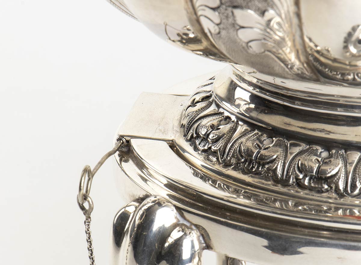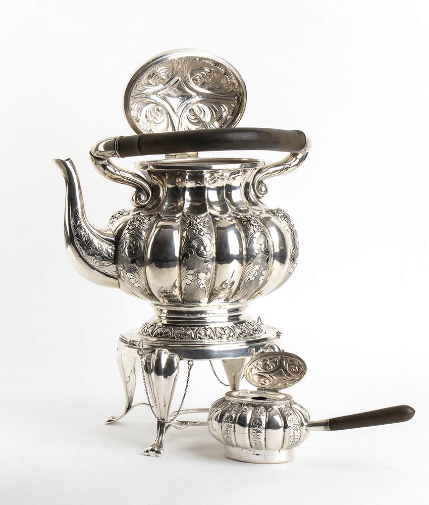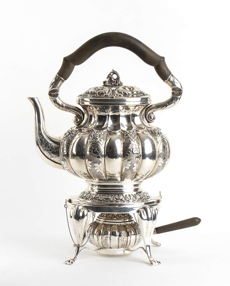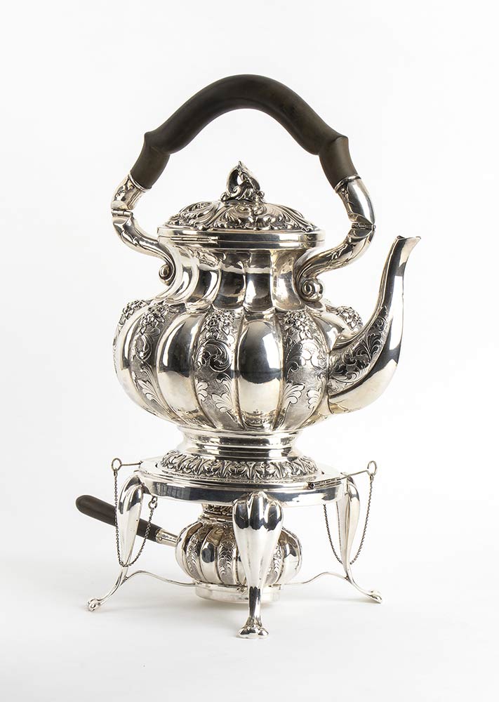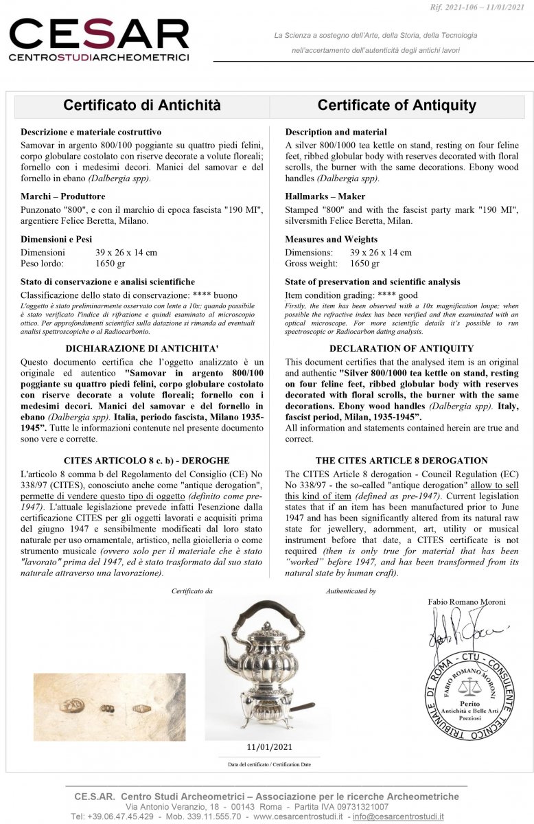 poggiante su quattro piedi felini, corpo globulare costolato con riserve decorate a volute floreali; fornello con i medesimi decori. Manici del samovar e del fornello in ebano (Dalbergia spp). Punzonato "800" e con il marchio di epoca fascista "190 MI", argentiere Felice Beretta, Milano. Dimensioni 39 x 26 x 14 cm. Peso lordo 1650 gr. Stato di conservazione: **** buono. uesto lotto contiene avorio/corallo/tartaruga o altre specie protette dalla regolamentazione CITES (the Convention on International Trade in Endangered Species of Wild Fauna and Flora). A causa dei recenti cambiamenti nella legislazione di molti paesi (ad es. USA o Cina) sulle specie in via di estinzione tra cui corallo, avorio e tartaruga - BFA raccomanda agli acquirenti di verificare con il proprio governo eventuali requisiti di importazione prima di effettuare un'offerta. Ad esempio, le normative statunitensi limitano l'importazione di avorio di elefante; BFA non assisterà quindi gli acquirenti nella spedizione di questo lotto negli Stati Uniti. Chi fosse interessato è pregato di mettersi in contatto con i nostri uffici prima dell'asta CITES ARTICOLO 8 c. b) – DEROGHE L'articolo 8 comma b del Regolamento del Consiglio (CE) No 338/97 (CITES), conosciuto anche come ""antique derogation"", permette di vendere questo tipo di oggetto (definito come pre-1947). L'attuale legislazione prevede infatti l'esenzione dalla certificazione CITES per gli oggetti lavorati e acquisiti prima del giugno 1947 e sensibilmente modificati dal loro stato naturale per uso ornamentale, artistico, nella gioielleria o come strumento musicale (ovvero solo per il materiale che è stato ""lavorato"" prima del 1947, ed è stato trasformato dal suo stato naturale attraverso una lavorazione). Il certificato gemmologico è disponibile a pagamento dopo l'asta