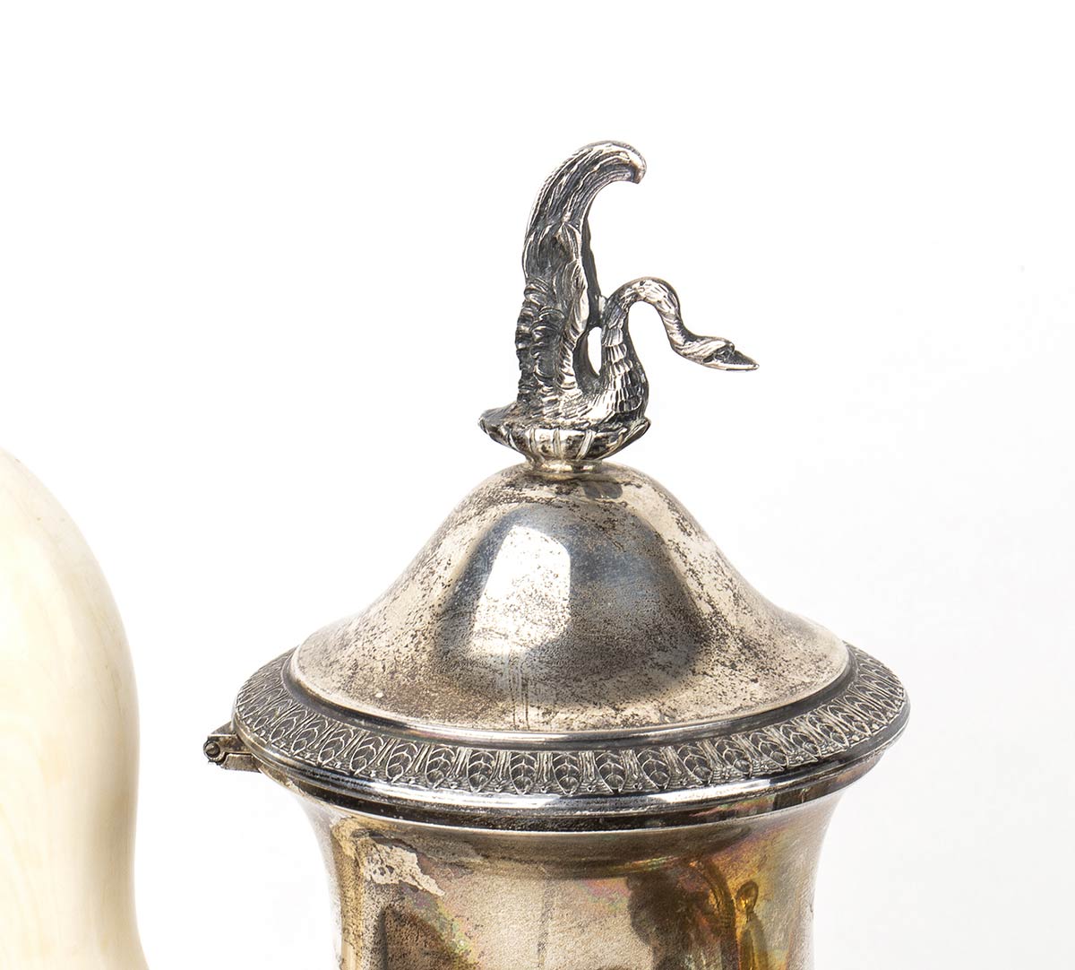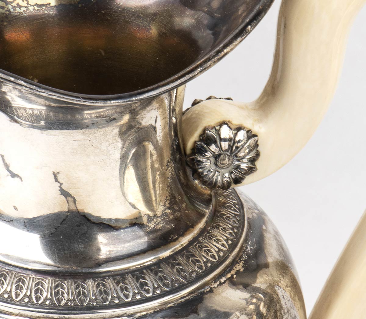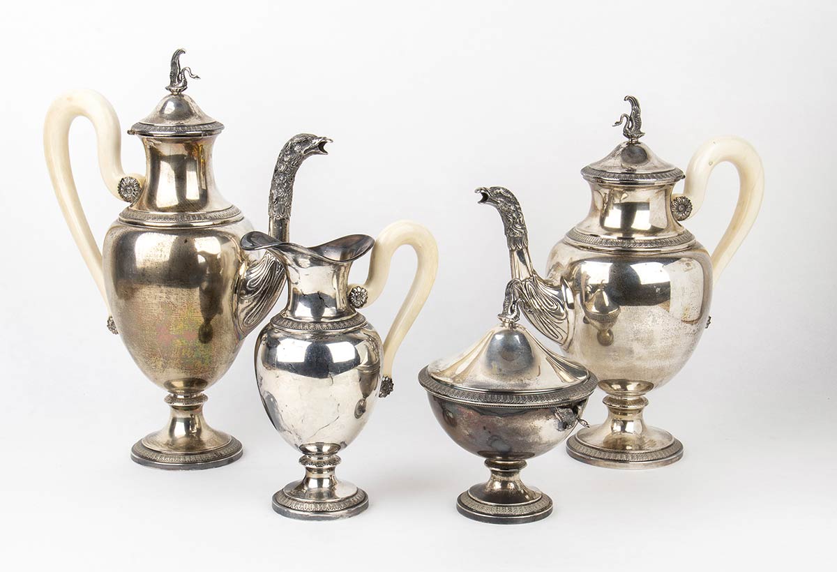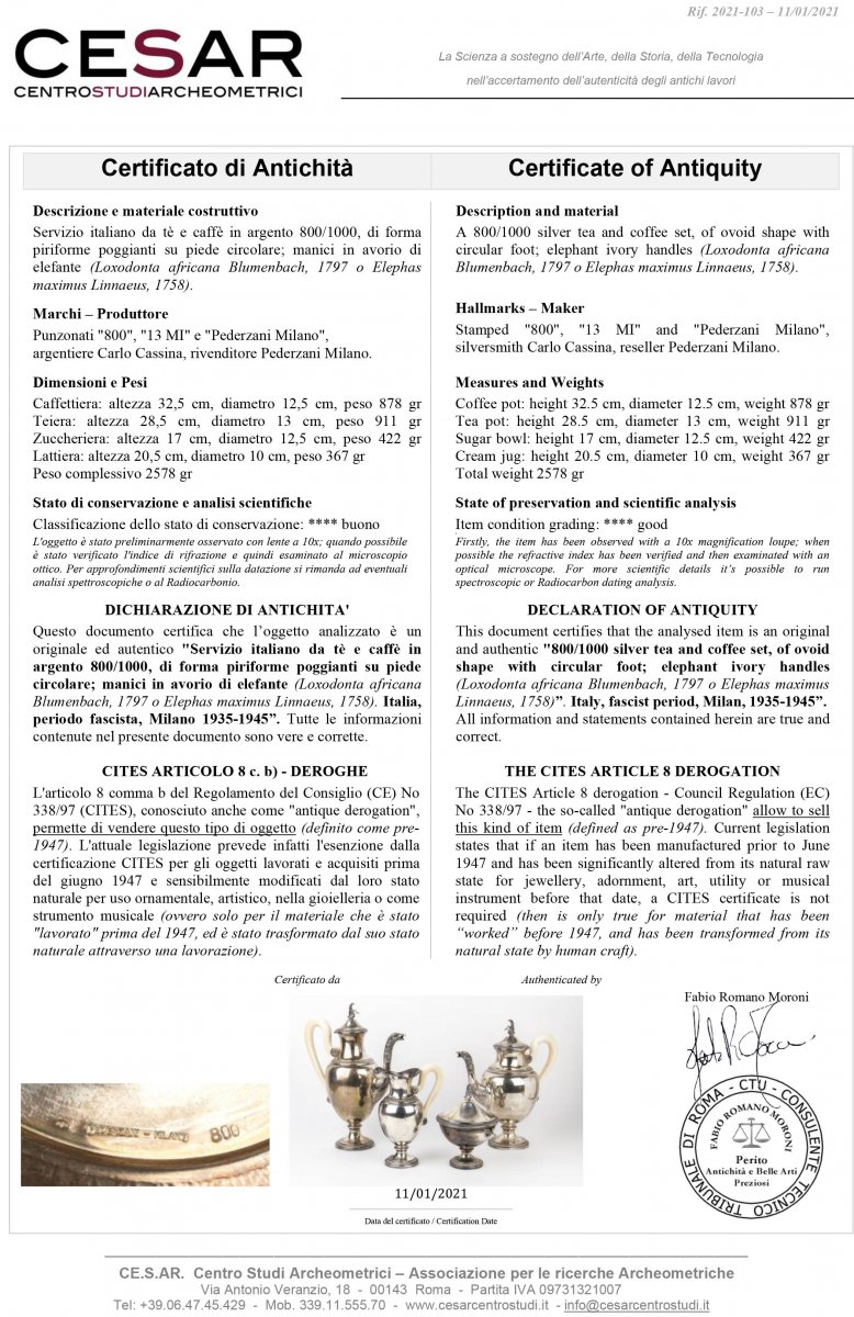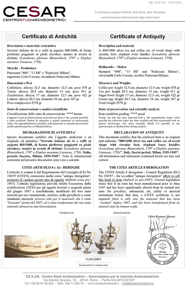 di forma piriforme poggianti su piede circolare, manici in avorio di elefante (Loxodonta africana Blumenbach, 1797 o Elephas maximus Linnaeus, 1758). Punzonati "800", con il marchio di epoca fascista "13 MI" e "Pederzani Milano", argentiere Carlo Cassina, rivenditore Pederzani Milano. Caffettiera: altezza 32,5 cm, diametro 12,5 cm, peso 878 gr. Teiera: altezza 28,5 cm, diametro 13 cm, peso 911 gr. Zuccheriera: altezza 17 cm, diametro 12,5 cm, peso 422 gr. Lattiera: altezza 20,5 cm, diametro 10 cm, peso 367 gr. Peso complessivo 2578 gr. Stato di conservazione: **** buono. Accompagnato da certificato di antichità Ce.S.Ar. Centro Studi Archeometrici (pre-1947). uesto lotto contiene avorio/corallo/tartaruga o altre specie protette dalla regolamentazione CITES (the Convention on International Trade in Endangered Species of Wild Fauna and Flora). A causa dei recenti cambiamenti nella legislazione di molti paesi (ad es. USA o Cina) sulle specie in via di estinzione tra cui corallo, avorio e tartaruga - BFA raccomanda agli acquirenti di verificare con il proprio governo eventuali requisiti di importazione prima di effettuare un'offerta. Ad esempio, le normative statunitensi limitano l'importazione di avorio di elefante; BFA non assisterà quindi gli acquirenti nella spedizione di questo lotto negli Stati Uniti. Chi fosse interessato è pregato di mettersi in contatto con i nostri uffici prima dell'asta CITES ARTICOLO 8 c. b) – DEROGHE L'articolo 8 comma b del Regolamento del Consiglio (CE) No 338/97 (CITES), conosciuto anche come ""antique derogation"", permette di vendere questo tipo di oggetto (definito come pre-1947). L'attuale legislazione prevede infatti l'esenzione dalla certificazione CITES per gli oggetti lavorati e acquisiti prima del giugno 1947 e sensibilmente modificati dal loro stato naturale per uso ornamentale, artistico, nella gioielleria o come strumento musicale (ovvero solo per il materiale che è stato ""lavorato"" prima del 1947, ed è stato trasformato dal suo stato naturale attraverso una lavorazione). Il certificato gemmologico è disponibile a pagamento dopo l'asta