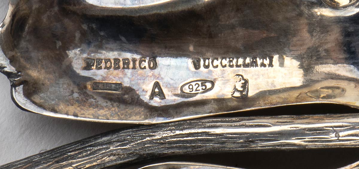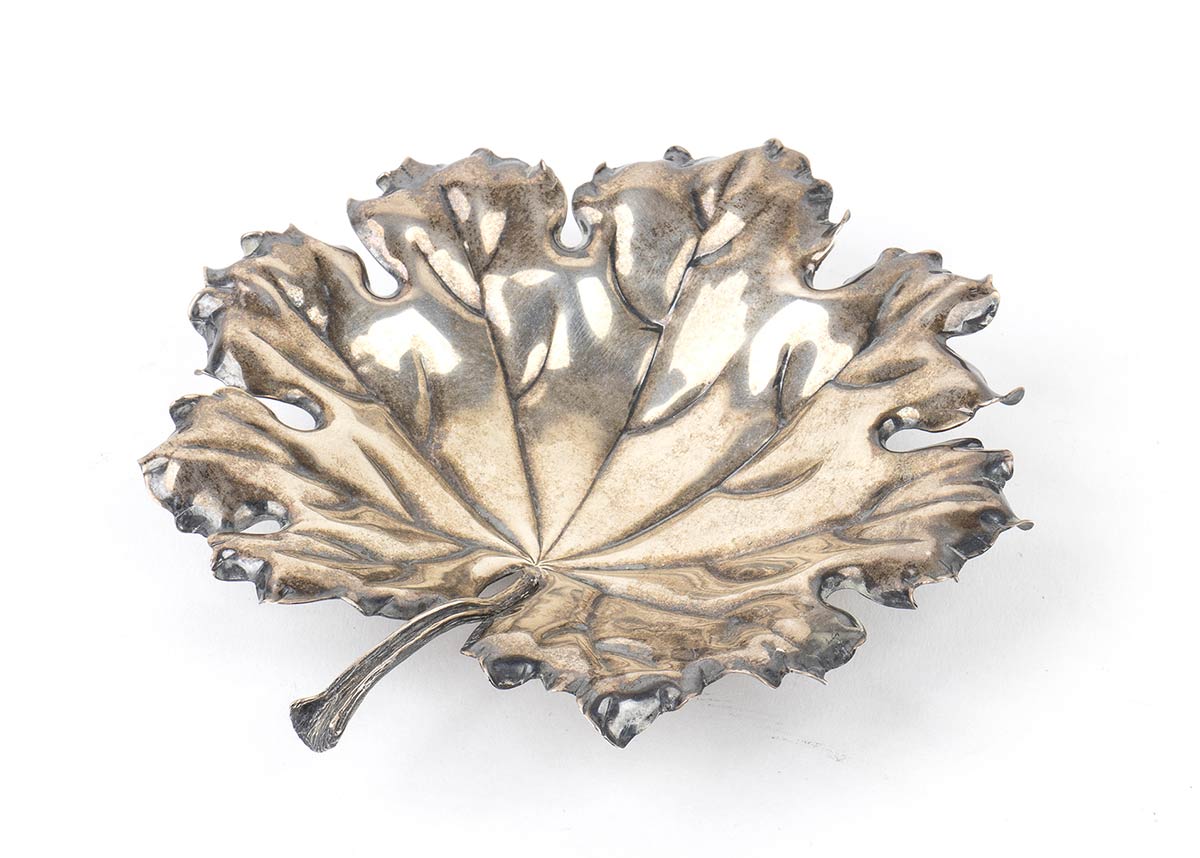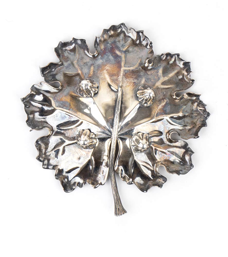 a forma di foglia poggiante su quattro piedini. Punzonato "Federico Buccellati", "925" e marchio di fabbrica dopo il 1968. Altezza 2,5 cm, diametro 13,3 cm. Peso 79 gr. Stato di conservazione: **** buono.