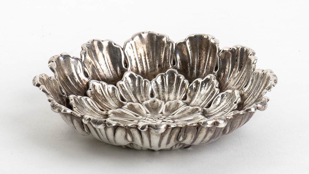 Collezione Fiori, "Dahlia". Punzonato "925", marchio di fabbrica dopo il 1968 "1 BO" e "Gianmaria Buccellati", argentiere Clementi per Gianmaria Buccellati, Milano. Altezza 2,5 cm, diametro 11,5 cm. Peso 99 gr. Stato di conservazione: **** buono.