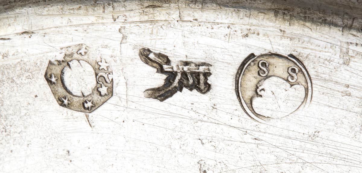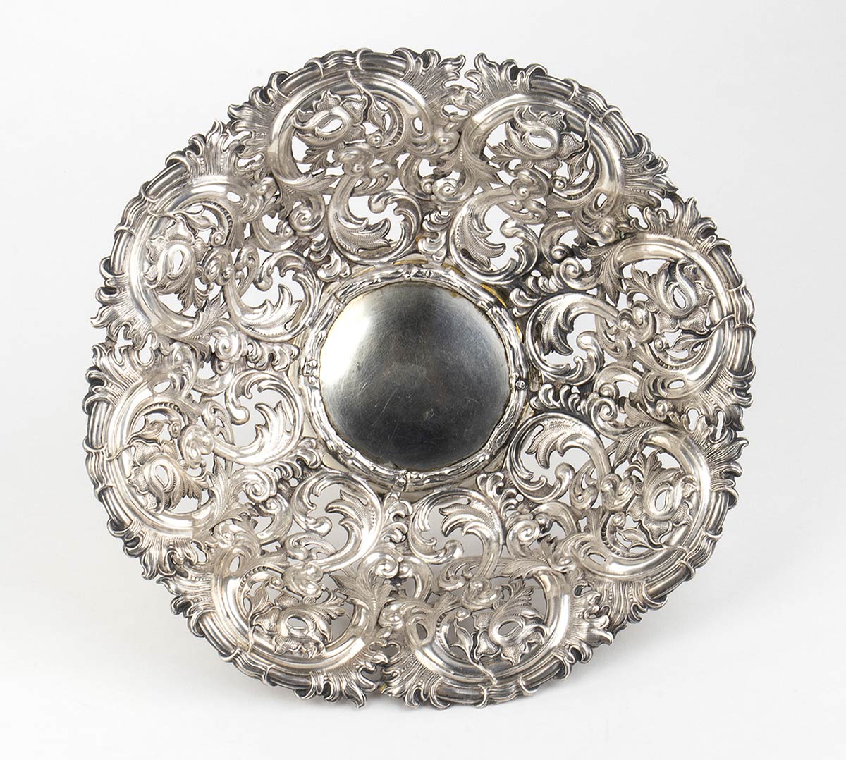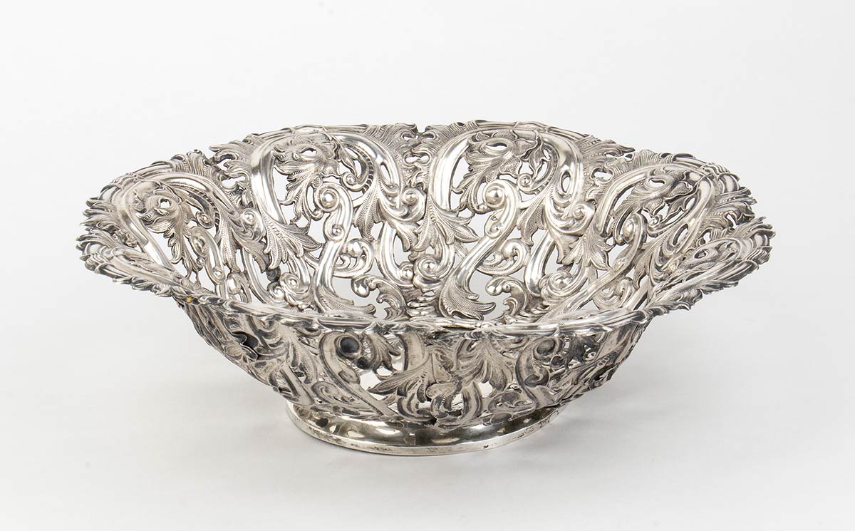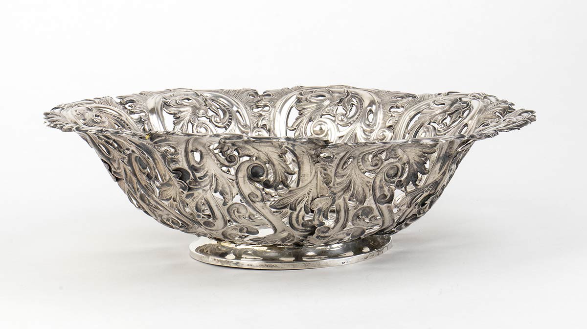 di forma rotonda traforata con decorazioni fogliate. Punzonato Regno Lombardo Veneto, Milano, marchi in uso dal 1812 al 1872. Diametro 25,5 cm, altezza 7 cm. Peso 547 gr. Stato di conservazione: **** buono.